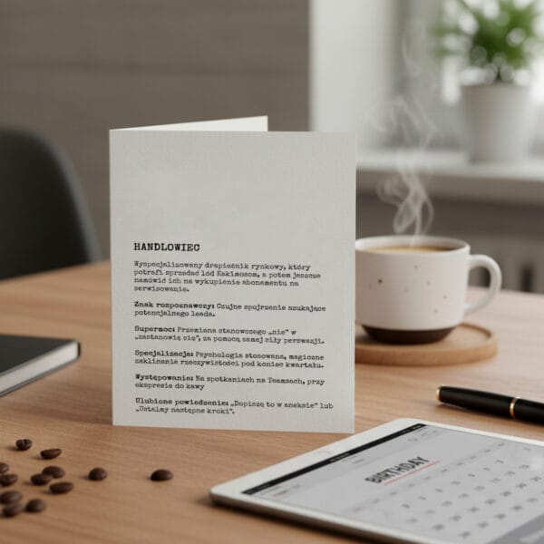 Masz w swoim otoczeniu kogoś, kto potrafi przekonać każdego do wszystkiego? Tę osobę, która z uśmiechem na ustach zamieni „zastanowię się” w podpisany kontrakt, zanim zdążysz zaparzyć drugą kawę? Nasza kartka to humorystyczna „definicja” tego, kim jest rasowy handlowiec, przedstawiona w formie minimalistycznego maszynopisu.