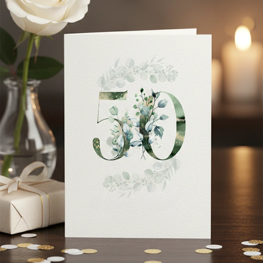 Pół wieku to dopiero początek przygody! Pięćdziesiątka wcale nie musi być „poważna” – może być lekka, zielona i pełna wdzięku. Ta kartka z motywem eukaliptusa to idealny sposób, by powiedzieć: „Cieszę się, że jesteś!”. Elegancka z zewnątrz, czuła w środku – gotowa, by pomieścić Twoje najszczersze życzenia dla kogoś wyjątkowego.