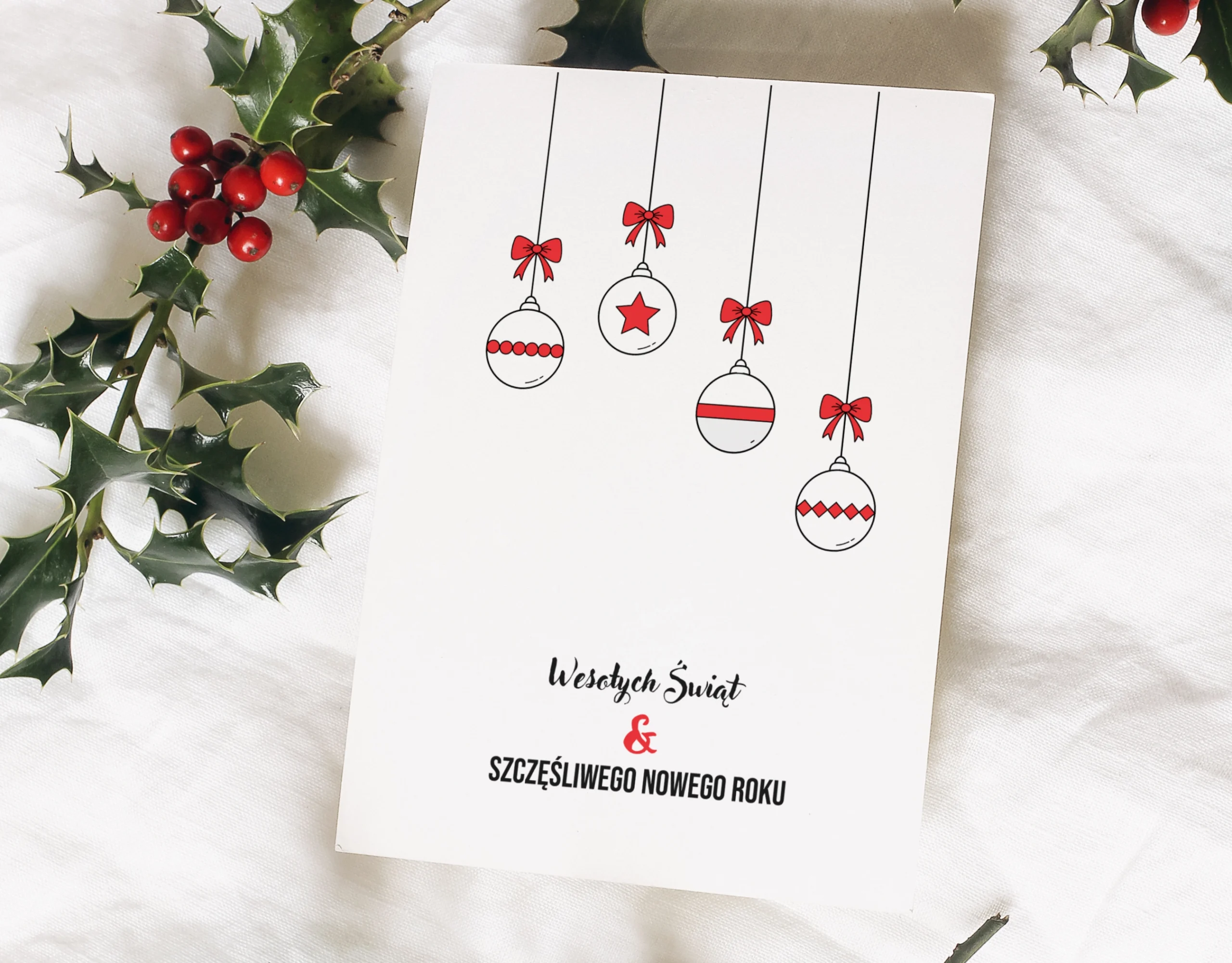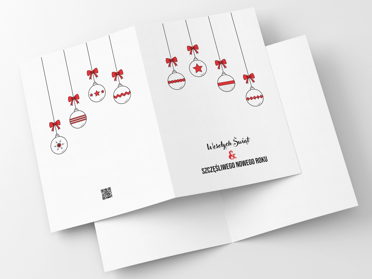 Nasze bombki na grafice wyglądają, jakby właśnie wróciły z eleganckiego przyjęcia – mają zawadiackie czerwone kokardki i wzorki, które dodają im lekkości. Stylistyka jest nowoczesna i „lekka”, dzięki czemu kartka nie przytłacza, a raczej zostawia przestrzeń na to, co najważniejsze: Twoje ciepłe słowa.