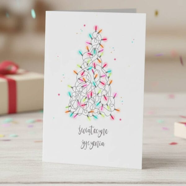 Ta kartka to ukłon w stronę wszystkich, którzy co roku zaczynają święta od walki z poplątanymi lampkami – i kończą je z ciepłem w sercu (i kolorami w oczach).
