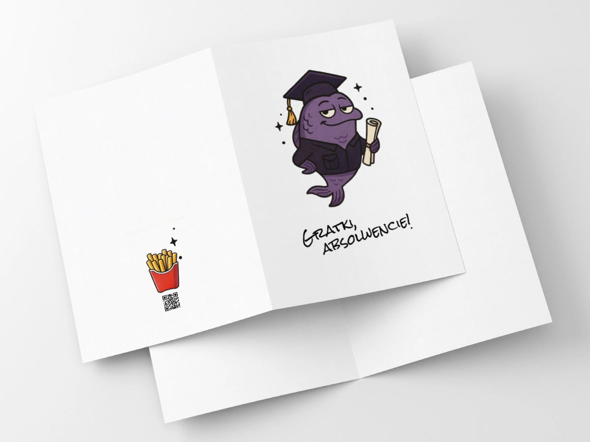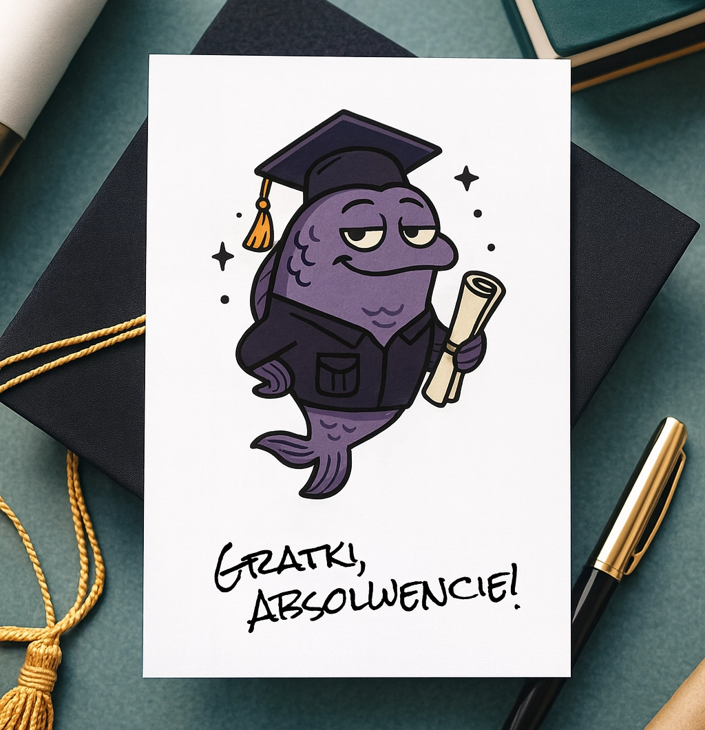 Kartka z rybką absolwentem podwodnego uniwersytetu Vibepic SVG – gatunek niezwykle rzadki, występujący głównie w okolicach sesji, obron i szatni pełnych togi.