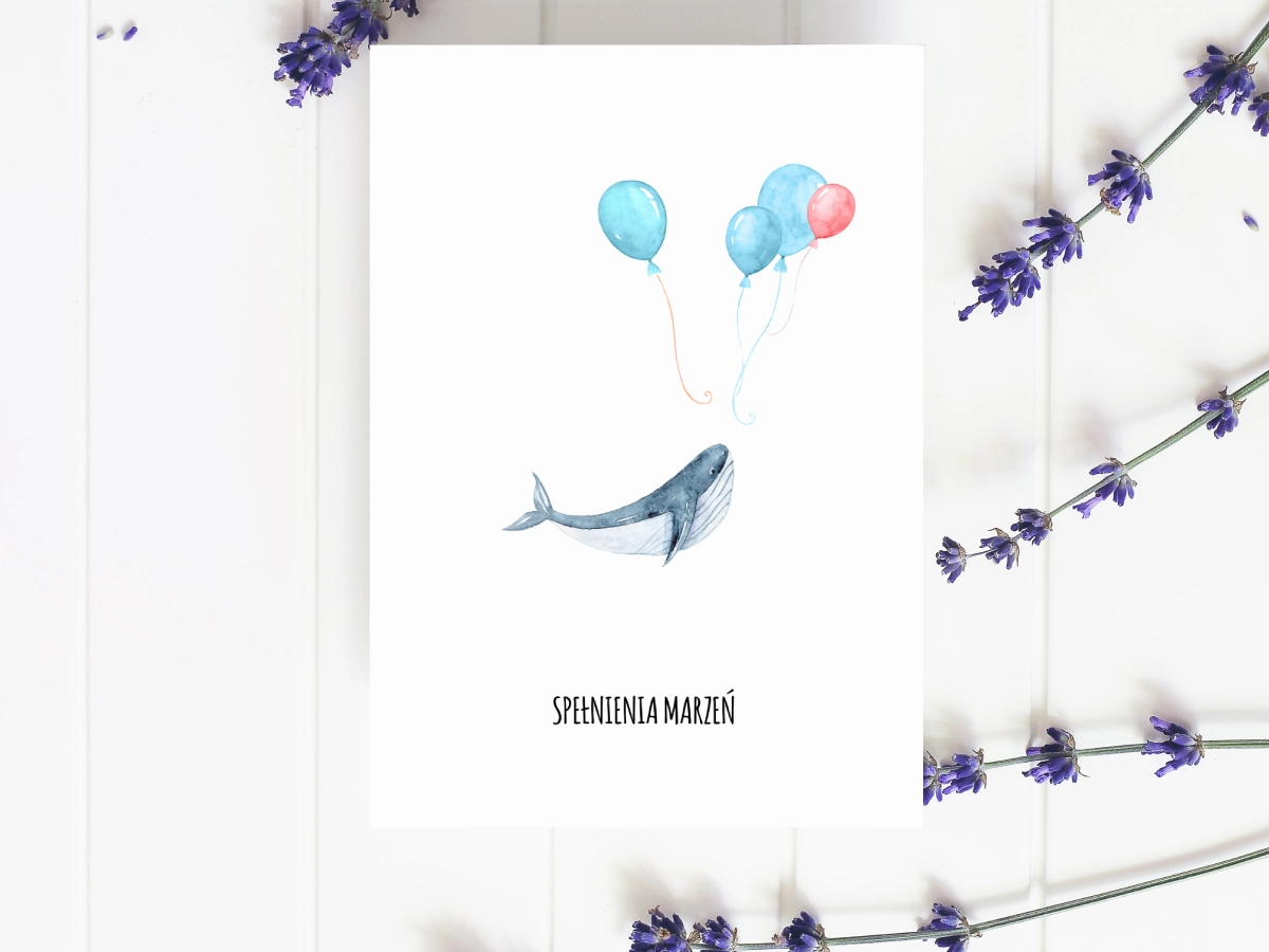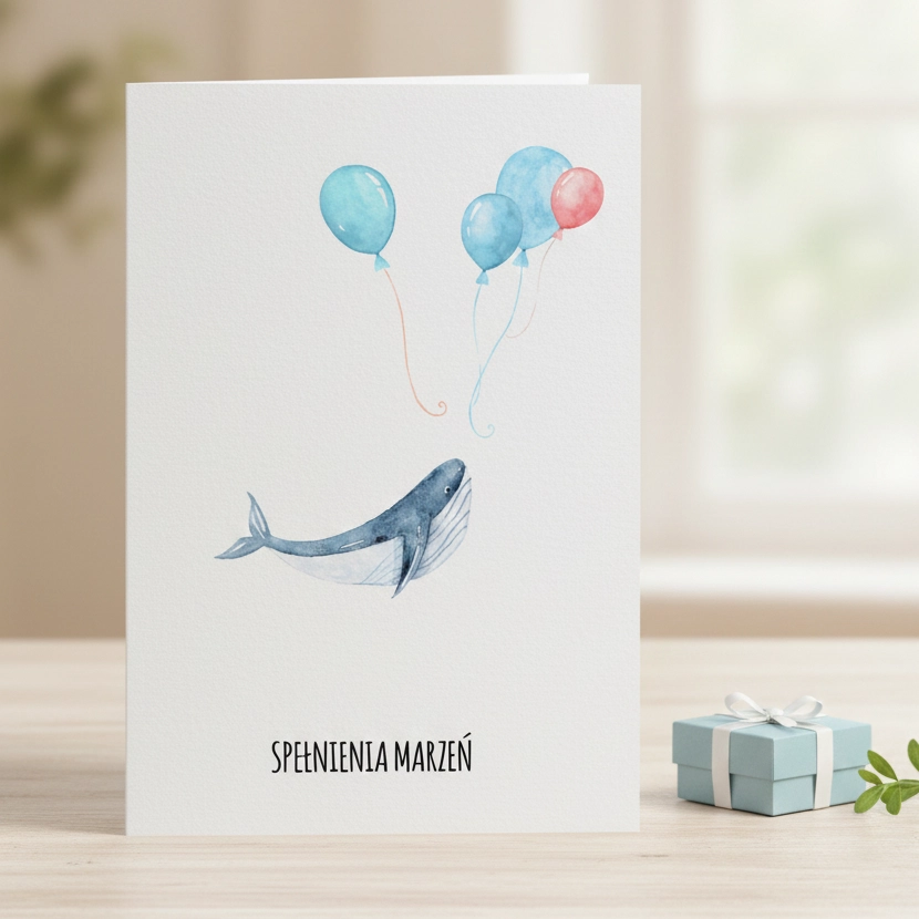 Spójrzmy prawdzie w oczy: większość z nas dorasta i zapomina, jak to jest chcieć latać. Ale nie dziecko, któremu podarujesz tę kartkę. Przedstawiamy wieloryba, który zamiast trzymać się kurczowo dna oceanu, postanowił dryfować w chmurach za pomocą kilku kolorowych baloników. Czy to ma sens z punktu widzenia fizyki? Absolutnie żadnego. Czy jest przeurocze? Owszem.
