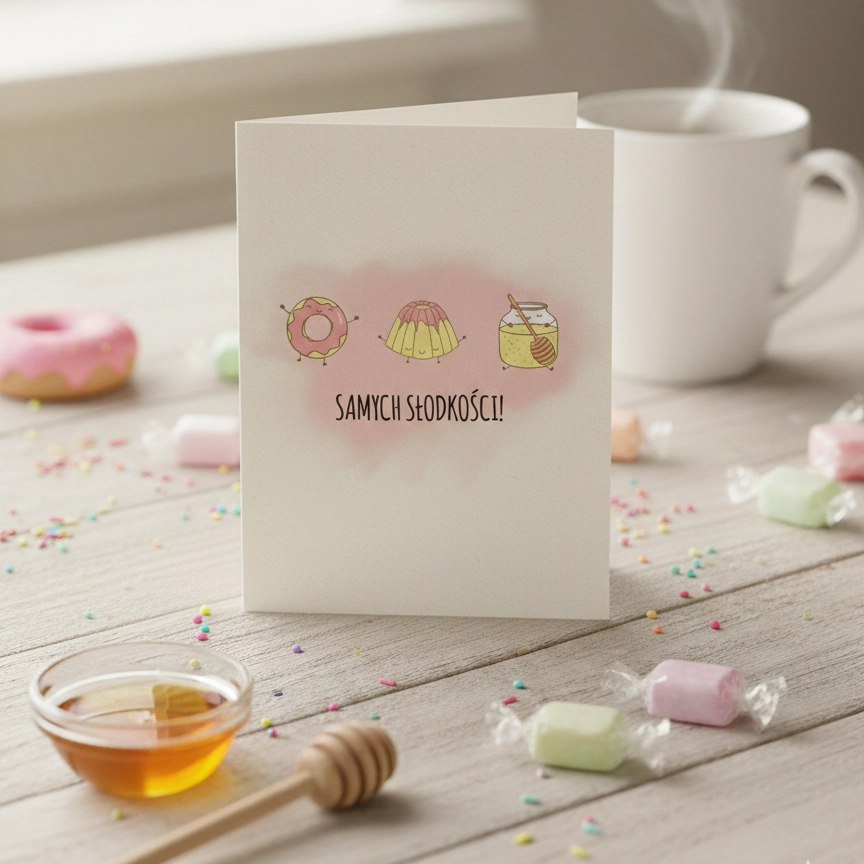 Umówmy się: dorosłość bywa gorzka jak przedawkowana kawa bez mleka, dlatego każdy gram cukru w czystej postaci jest na wagę złota. Ta kartka urodzinowa to taki wizualny cheat-day – mamy tu uśmiechniętego pączka, galaretkę w radosnym podrygu i słoik miodu, który wygląda na bardziej poukładanego niż większość z nas w poniedziałek rano.