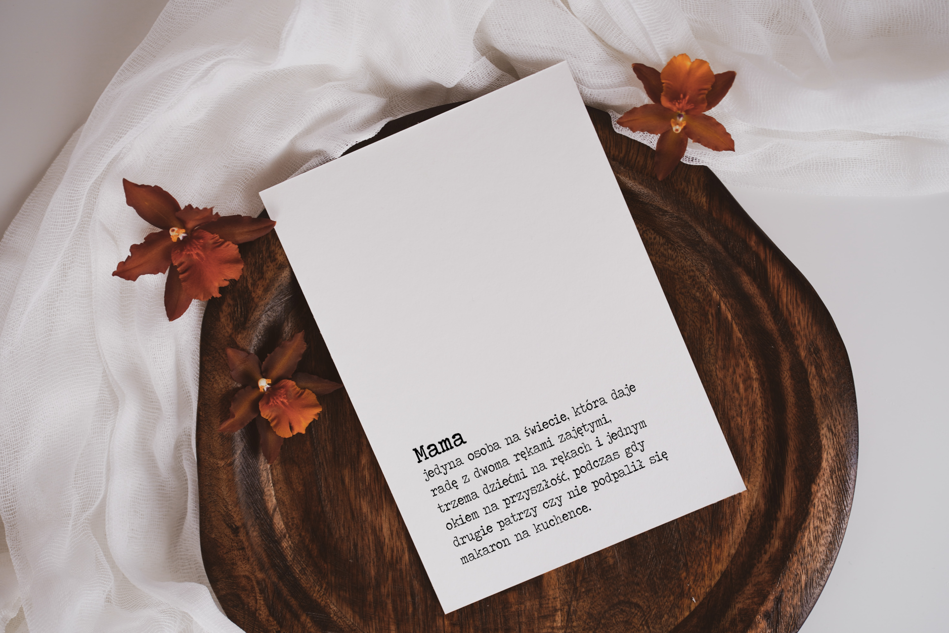 Ta kartka to ukłon w stronę codziennego geniuszu mamy – tego niewidzialnego multitaskingu, który sprawia, że wszyscy jakoś żyjemy. Trochę zabawna, trochę prawdziwa, totalnie zasłużona. Wręcz ją z wdzięcznością i poczuciem humoru. Albo przypnij magnesem na lodówce, żeby pamiętała, że ją widzisz.