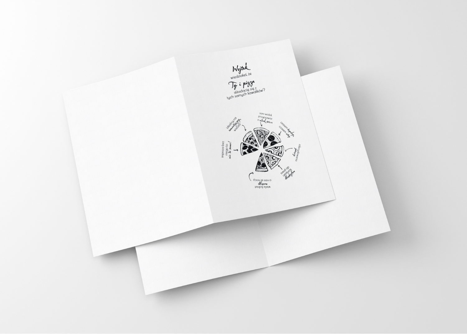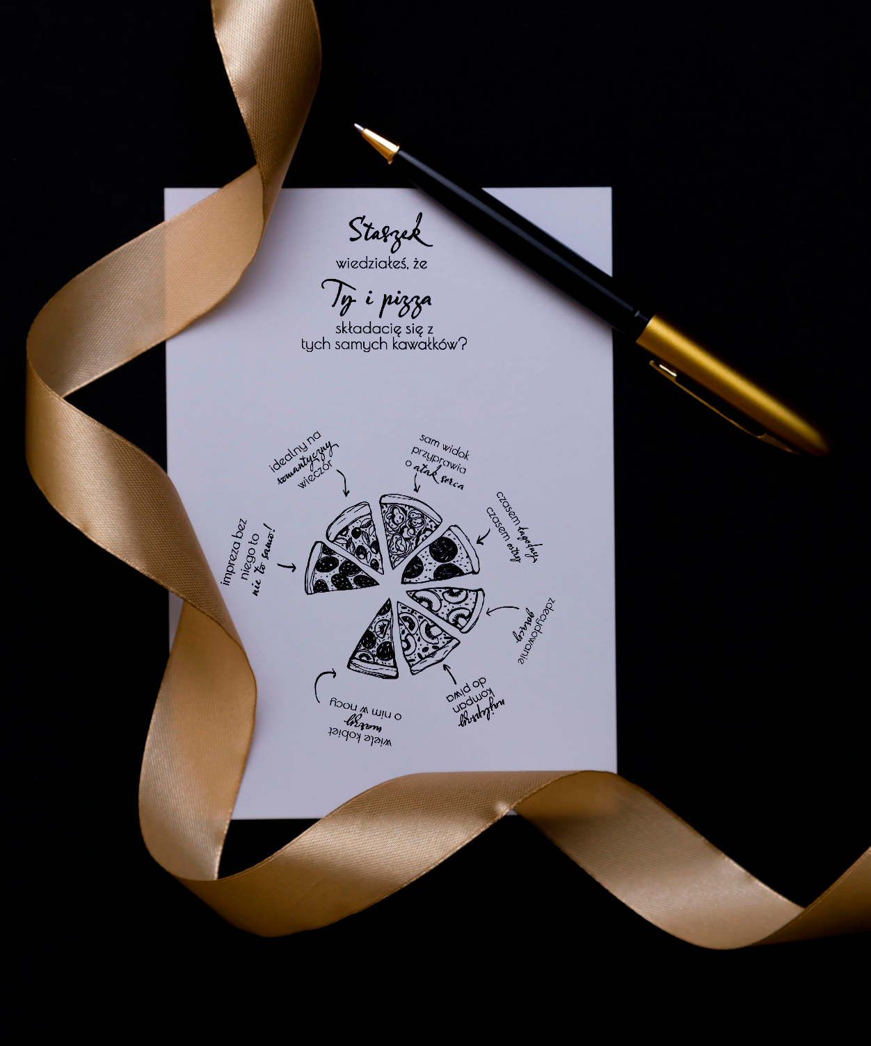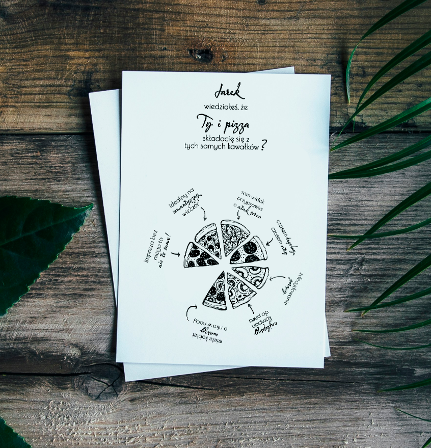 Ta kartka nie przynosi kalorii, tylko pochwały. Każdy kawałek pizzy to inny powód, dla którego obdarowany jest wyjątkowy: „idealny na romantyczny wieczór”, „impreza bez niego to nie to samo”, „najlepszy kompan do piwa”. Zamiast zwykłych życzeń – cała pizza komplementów, które smakują lepiej niż każdy ser.