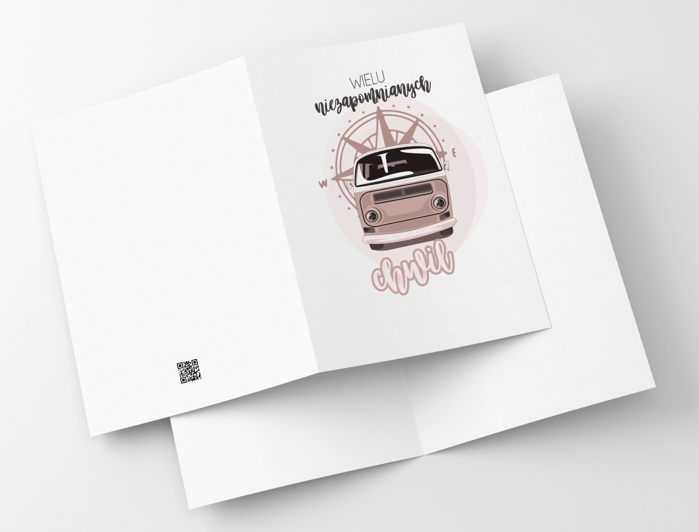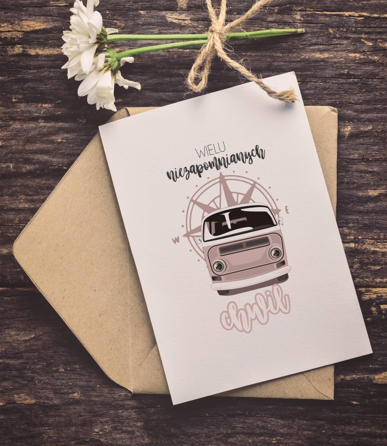Bo są tacy ludzie, którzy zamiast tortu marzą o bilecie lotniczym. A zamiast prezentu, o nowej przygodzie. Nie trzeba dużo by obudzić wewnętrznego backpackersa; wystarczy pastelowy van, symboliczny kompas i hasło „Wielu niezapomnianych chwil”. Kartka jest gotowa do druku, z miejscem w środku na wszystko, co ważne: życzenia, wspomnienia, plan wyprawy albo… listę przystanków z ubiegłego lata.