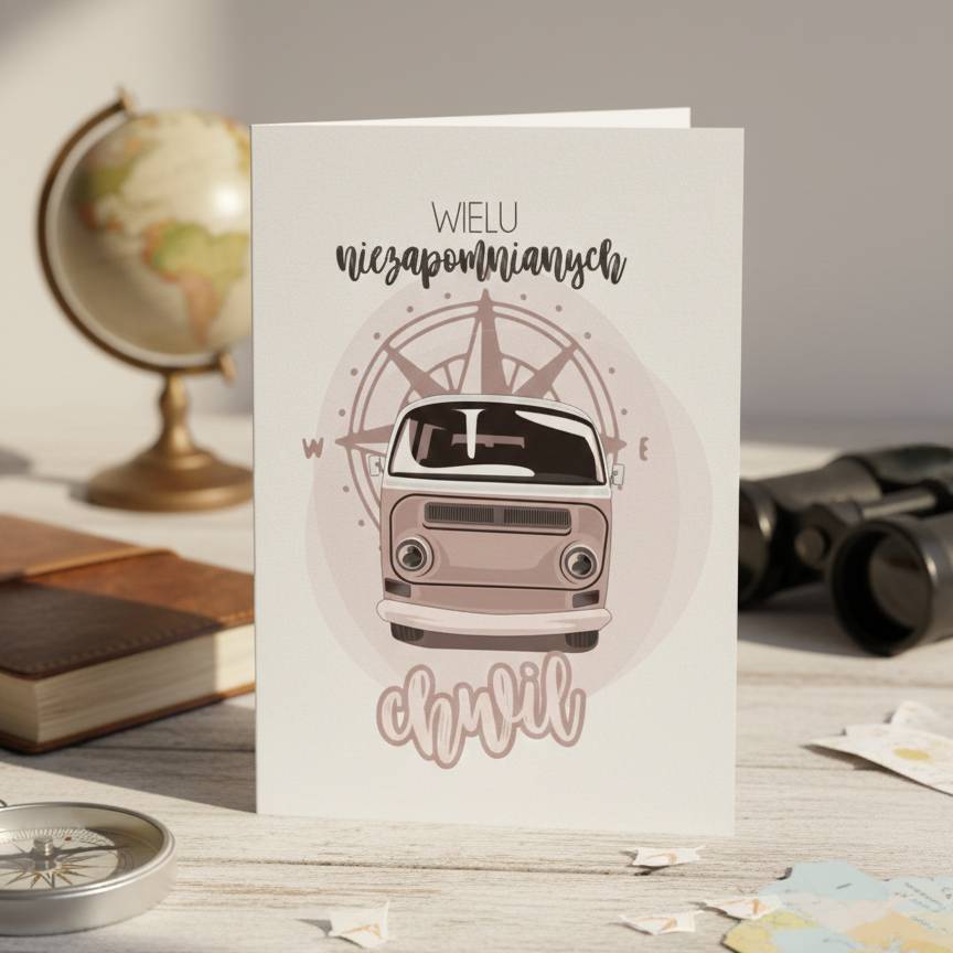 Masz znajomego, który ma urodziny i jednocześnie marzy, żeby wskoczyć do busa i zniknąć na mapie? Podaruj mu kartkę ze starym vanem, kompasem i hasłem „Wielu niezapomnianych chwil”, czyli dokładnie tym, co obiecuje każda podróż.