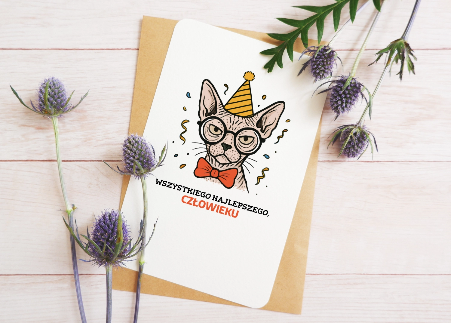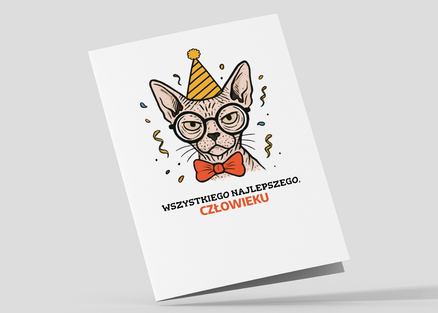 Śmieszna kartka urodzinowa z kotem, który patrzy na jubilata z lekką pogardą, ale jednak życzy mu „wszystkiego najlepszego, człowieku”. Idealna, gdy chcesz rozbawić znajomego i jednocześnie pokazać, że nawet koty wiedzą, że starzenie się to nie żart.