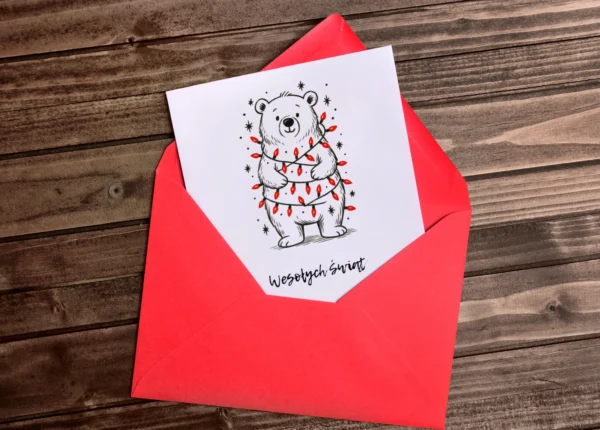 Miś zaplątany w światełka – czyli uroczy symbol tego, jak wyglądamy wszyscy w grudniu. Minimalistyczna kartka, która rozświetli każde święta (nawet jeśli lampki jednak nie działają). Minimalizm nie musi być chłodny – kartki czarno-białe potrafią przekazać więcej ciepła niż najbardziej kolorowe ozdoby.