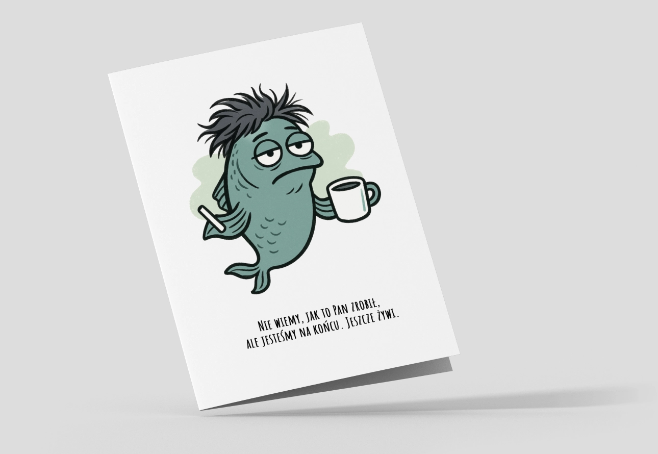 Kartka z wizualizacją nauczyciela, który wyprowadził całą klasę z edukacyjnego chaosu na prostą – z kawą w jednej płetwie i ostatnią resztką sił w drugiej. Ta kartka na zakończenie roku szkolnego to hołd dla faceta, który zasłużył na urlop bardziej niż ryba na głęboką wodę.