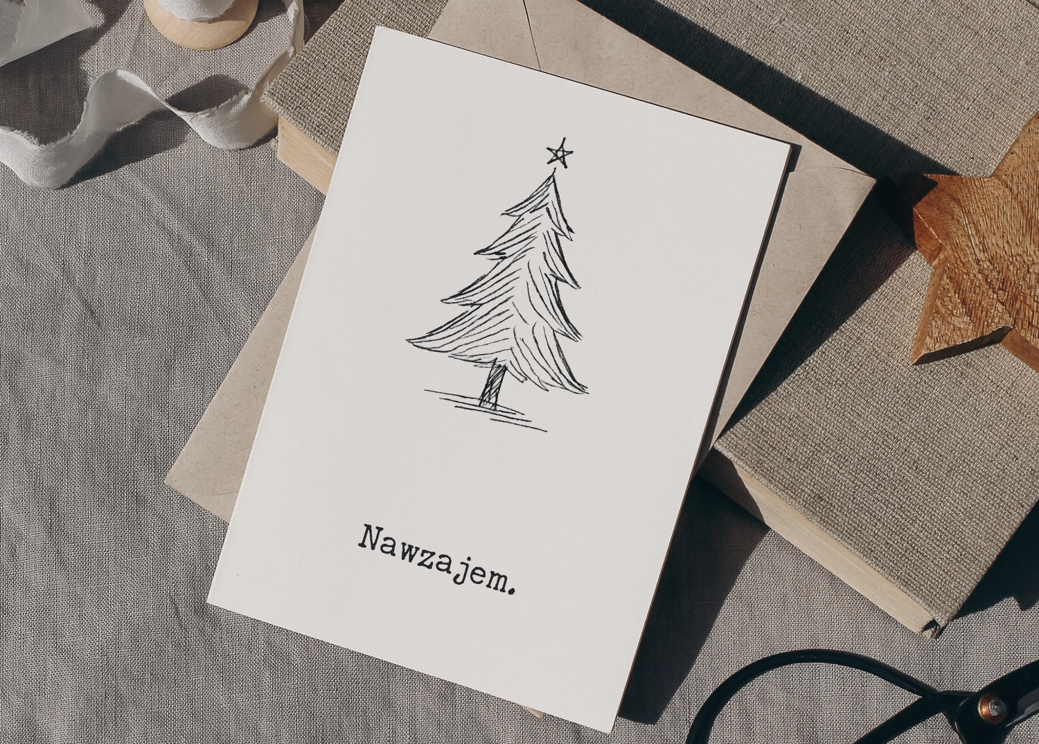 Kartka na Boże Narodzenie z choinką i słowem „Nawzajem”