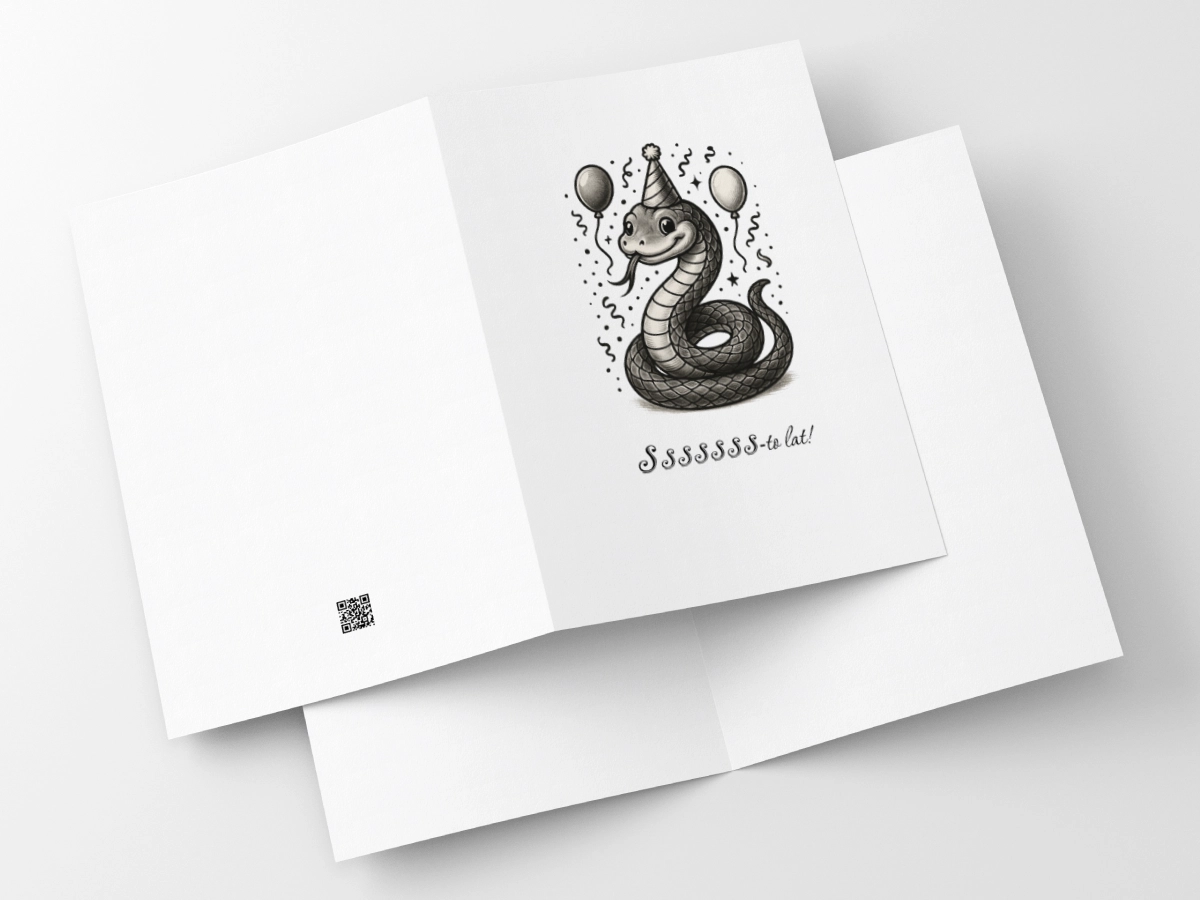 To jest kartka urodzinowa z wężem, z gatunku tych, które mówią: „Wszystkiego najlepszego… i niech Twoje urodziny będą absolutnie jadowicie fantastyczne!”. On też zrzuca skórę (w końcu to wąż), ale tylko po to, żeby pokazać, że z wiekiem jest jeszcze bardziej świeży i stylowy.