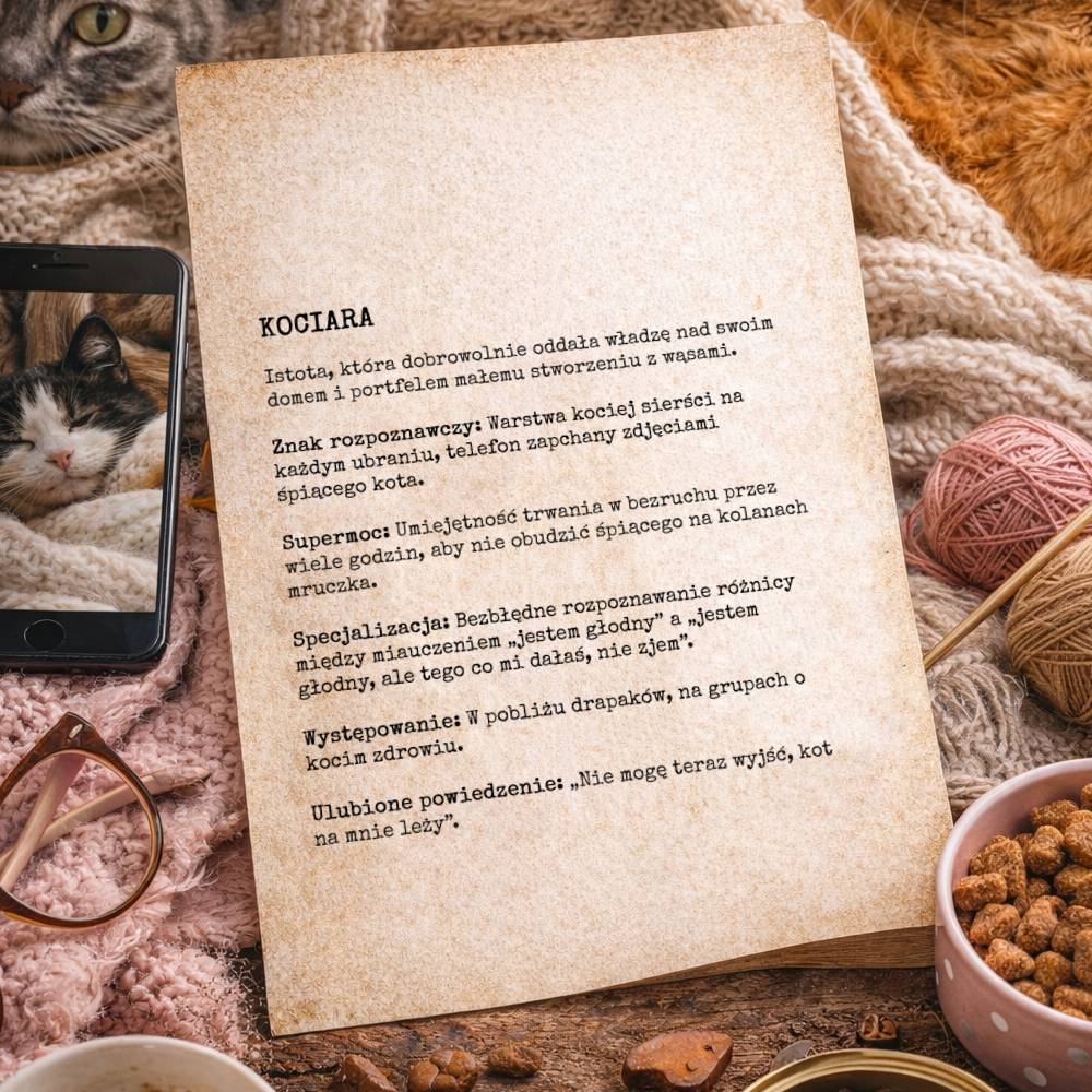 Nasza „Kociara” to czuła i zabawna definicja osoby, która dobrowolnie oddała władzę nad swoim domem (i portfelem) małemu stworzeniu z wąsami. To coś więcej niż zwykła kartka okolicznościowa z wyjaśnieniem pojęcia kociary. To wyraz uznania dla tej specyficznej supermocy, jaką jest trwanie w bezruchu przez wiele godzin, byle tylko nie obudzić śpiącego mruczka.