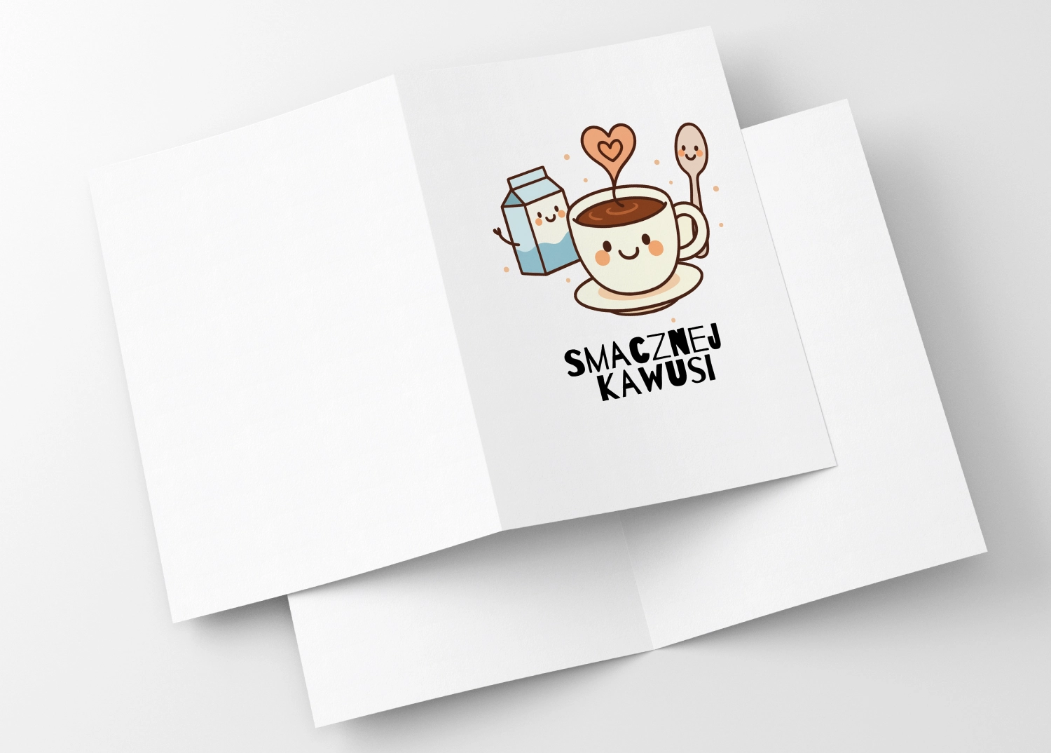 Ironia w niej tkwi w tym, że hasło „Smacznej kawusi” jest tak słodkie, że aż niebezpieczne. Bo każdy, kto naprawdę potrzebuje kawy, nie mówi „smacznej kawusi” – tylko warczy, dopóki kofeina nie dotrze do mózgu. To kartka, która udaje grzeczną, a w rzeczywistości mówi: Wiem, że jesteś na skraju, więc trzymaj się filiżanki jak reliktu normalności. Czyli: pozornie kawaii, w głębi duszy egzystencjalna.