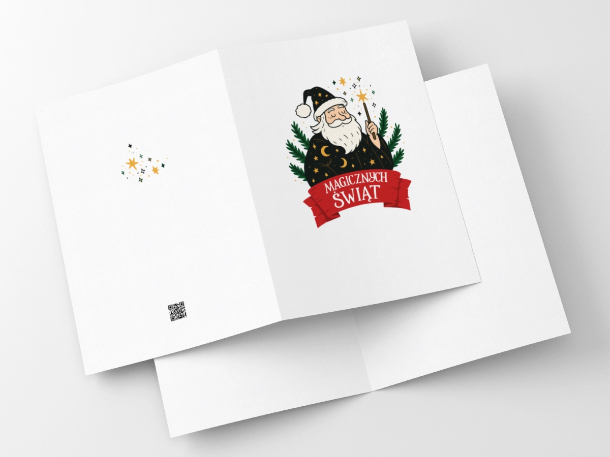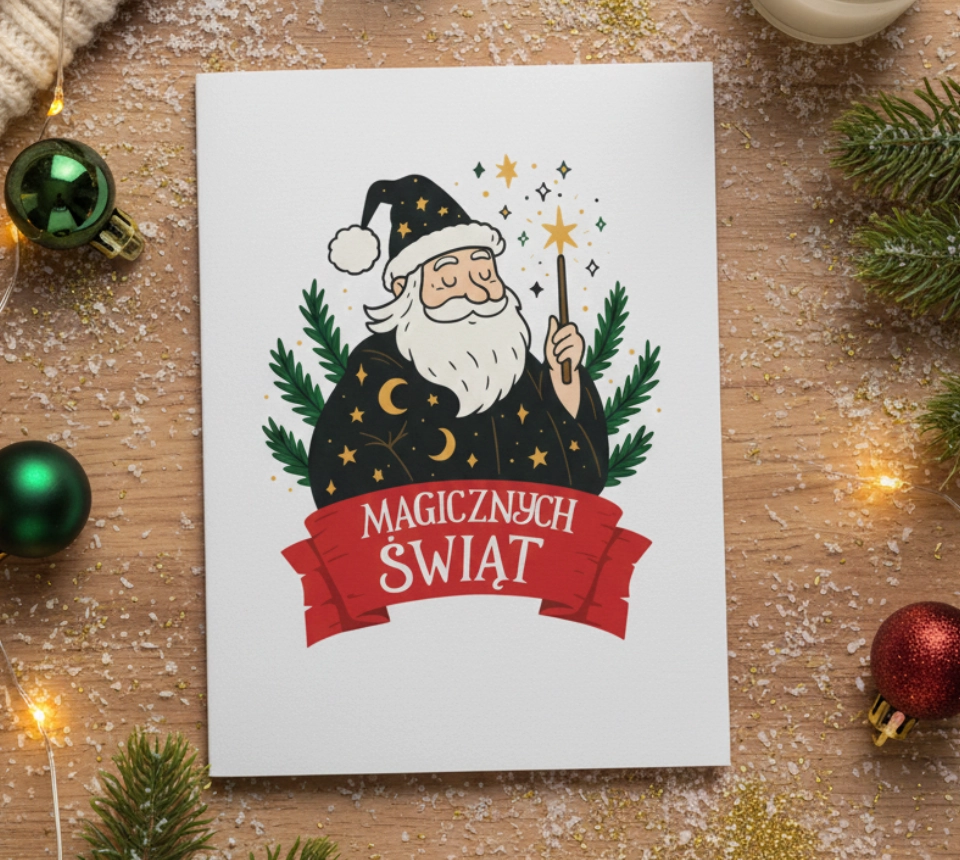 Na kartce widzimy naszego brodatego bohatera w niecodziennej, magicznej szacie (w gwiazdki i półksiężyce!), zamyślonego i skupionego na zadaniu. Zamiast worka prezentów trzyma magiczną różdżkę, którą właśnie wyczarowuje czystą magię i świąteczny czar.
