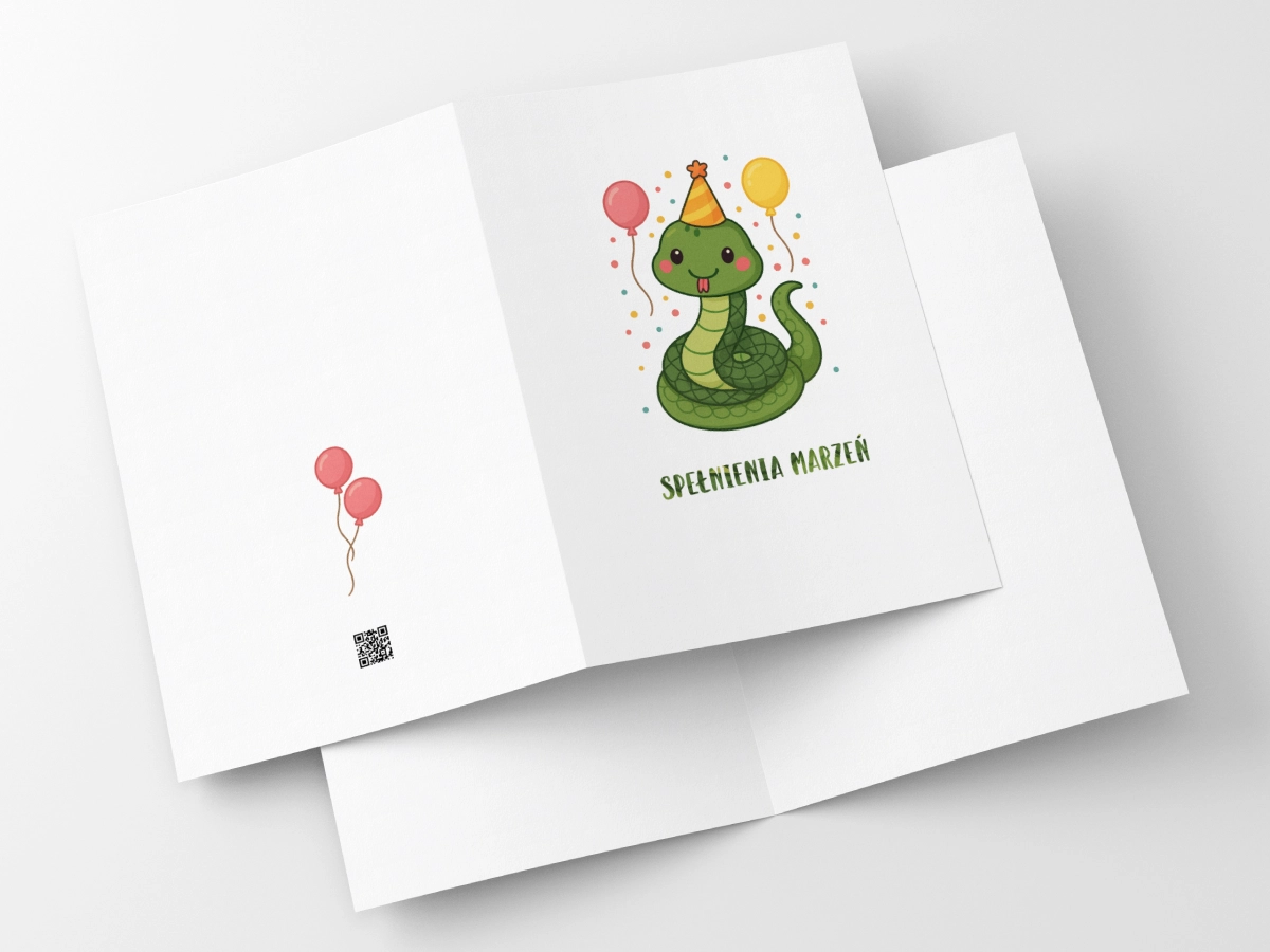 Wąż nie jest groźny – jest turbo przyjacielski. Trochę psotnik, trochę akrobata, trochę taki ziomek, który zawsze pojawia się tam, gdzie właśnie otwiera się prezent. Bo jak tu przegapić najfajniejszą część? Ta kartka świetnie sprawdzi się dla:
