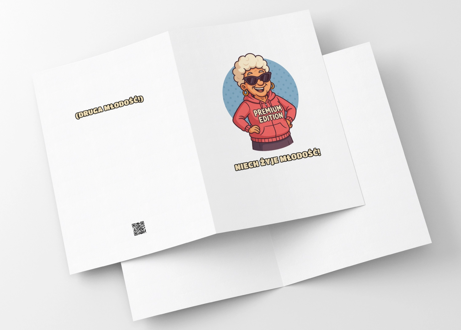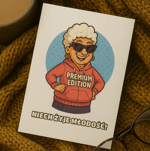 Kartka przedstawia kobietę w stylu „Premium Edition”. Dosłownie – ma to napisane na swojej czerwonej, młodzieżowej bluzie z kapturem. Na nosie ma wielkie, ciemne okulary, takie „nie przeszkadzaj, jestem ikoną”. Na uszach złote kolczyki, a na twarzy uśmiech osoby, która wie, że życie jest za krótkie, żeby nie śmiać się z własnych dowcipów. Stoi z rękami na biodrach w pozie: „No i co? Nadal uważasz, że babcie tylko robią na drutach?”