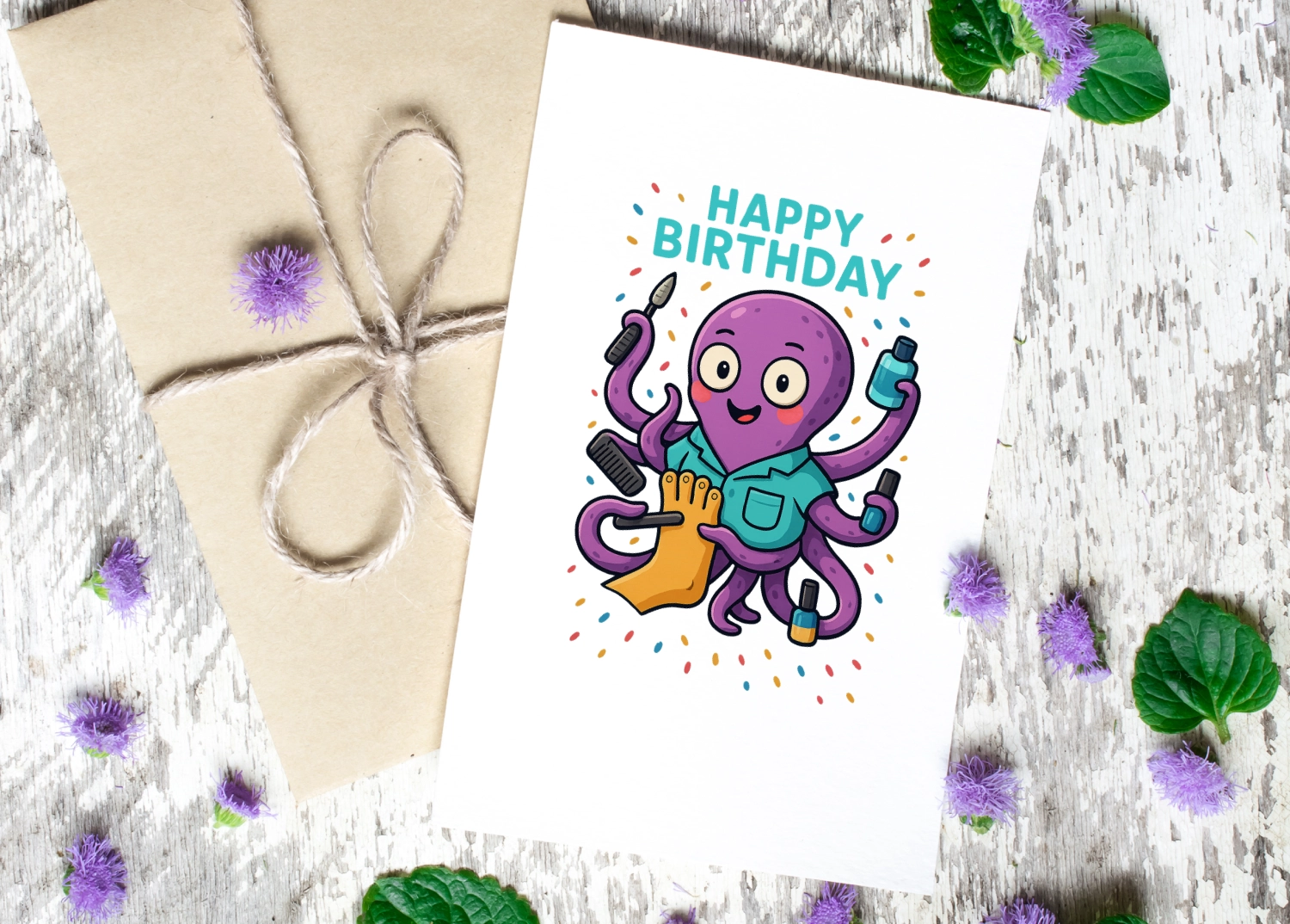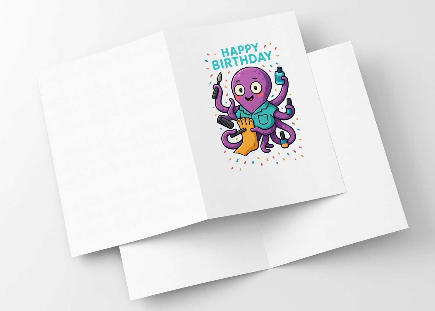 Kartka urodzinowa dla pedicurzystki kosmetyczki – Ośmiornica