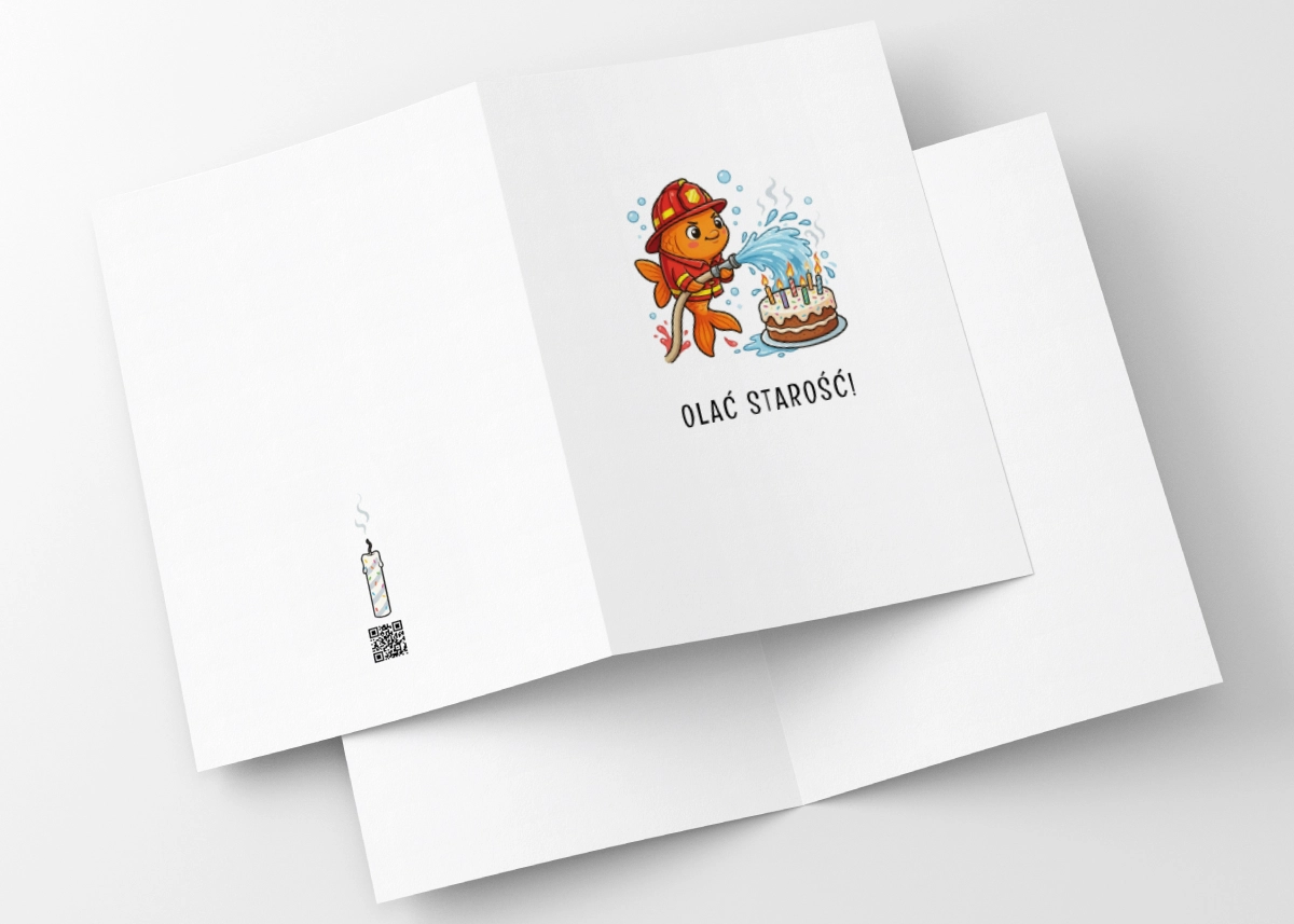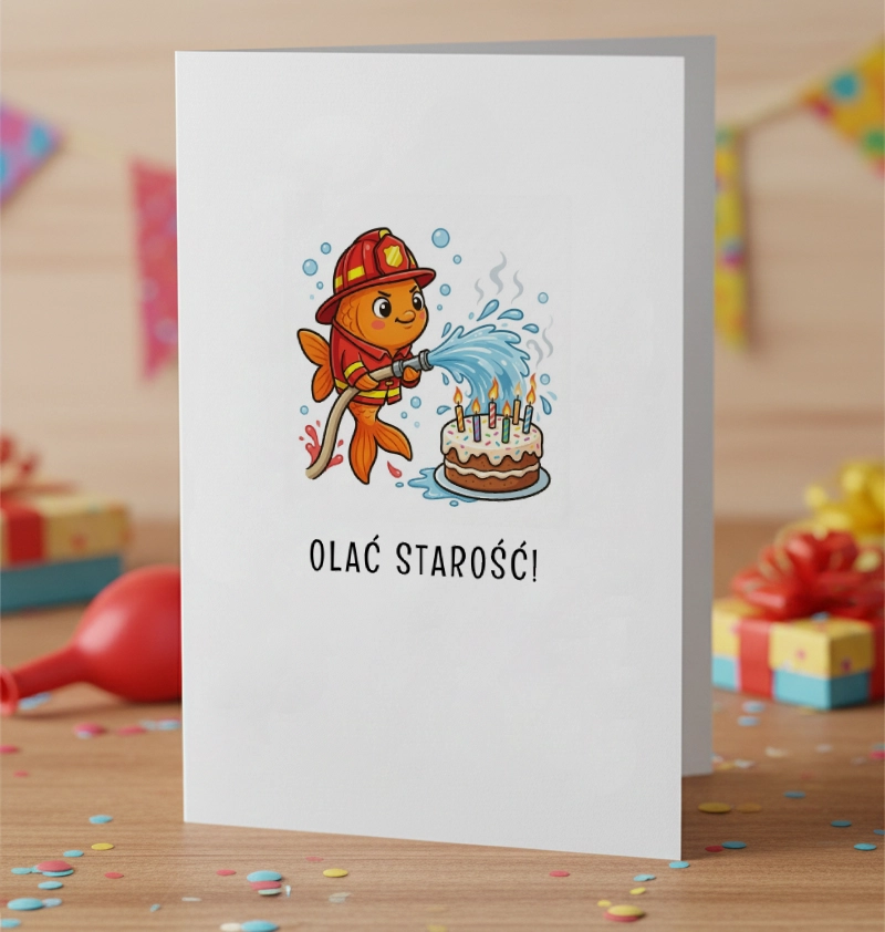 Kartka urodzinowa z rybką strażakiem – „olać starość!”