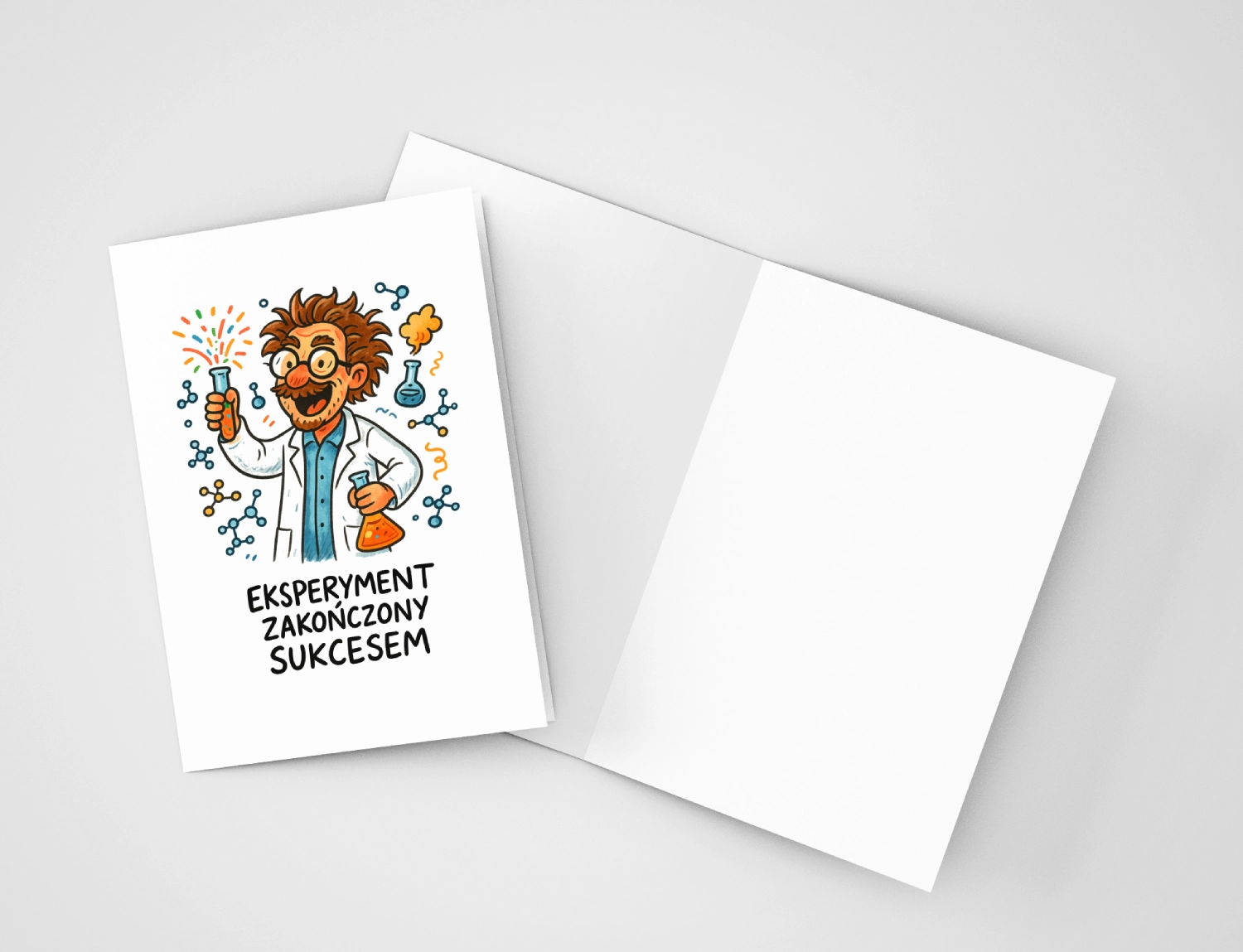Ten szalony naukowiec w kitlu wie, że życie to seria prób i błędów – głównie błędów, ale kto by to liczył? Kartka zrobiona z myślą o tych, którzy cenią humor, naukę i lekko chaotyczne gratulacje.