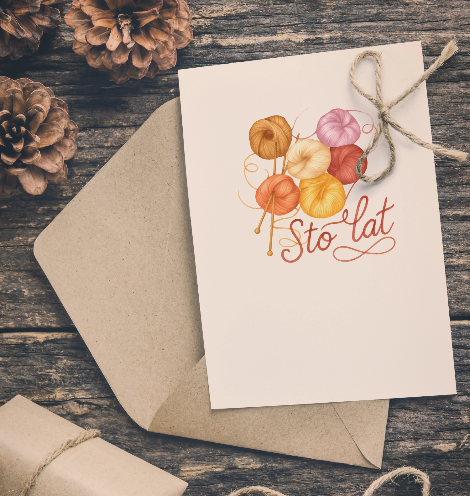 Ta kartka to marzenie każdej fanki drutów, szydełka i ciepłej herbaty w kubku z kotem. Zamiast klasycznych balonów – mamy tu kolorowe kłębki włóczki, które uniosły się w górę jakby miały za chwilę pofrunąć w stronę najbliższego klubu robótkowego. A pod nimi piękny, miękki napis „Sto lat” – taki, który brzmi jak życzenie i wygląda jak zrobiony z najdelikatniejszej wełny merino.