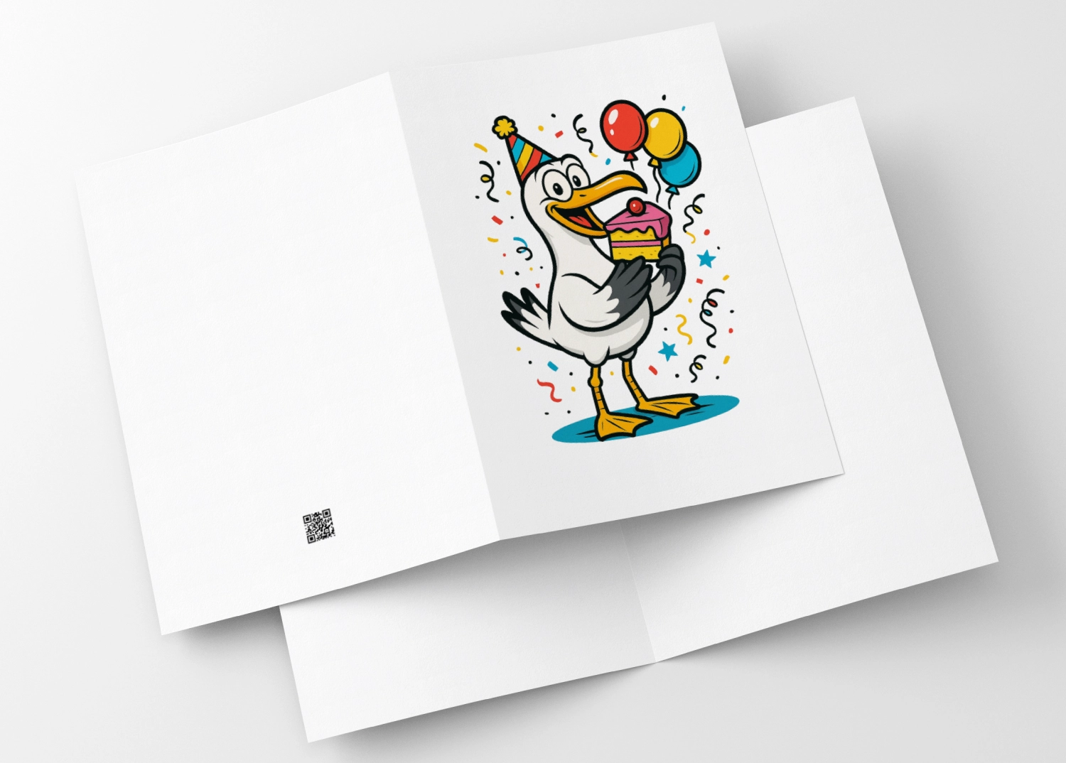 Patrzysz teraz na absolutny fenomen przyrody: kartkę urodzinową z mewą, która postanowiła, że w oceanicznym życiu trzeba mieć hobby – i wybrała imprezowanie. Ona widziała już tyle cudzych frytek, że teraz celuje wyżej – w torty urodzinowe. (ma czapeczkę urodzinową, bo zabrała ją dziecku z promenady).