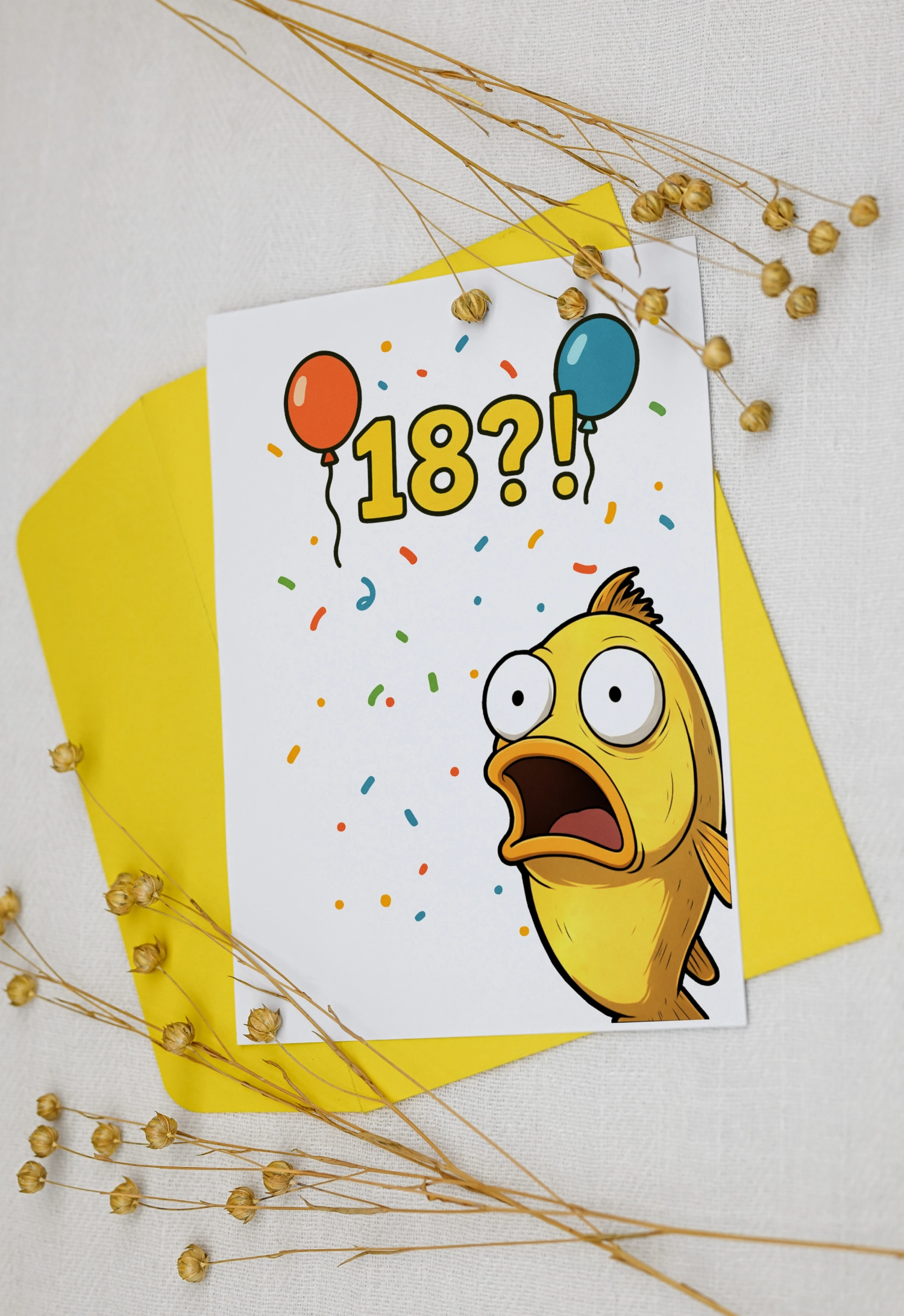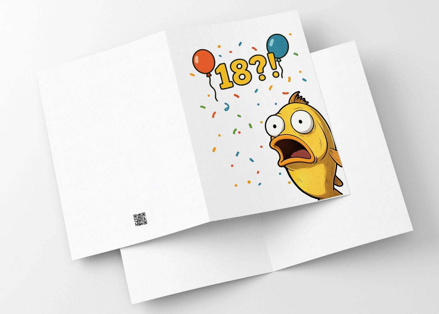 Kartka urodzinowa na 18-stkę z rybką w totalnym szoku. Bo przecież każdy, kto kończy 18 lat, wygląda mniej więcej tak: otwarte usta, niedowierzanie i pytanie „to już?!”. Idealna na prezent last minute i dla tych, którzy wolą śmiać się ze starości niż ją ukrywać.