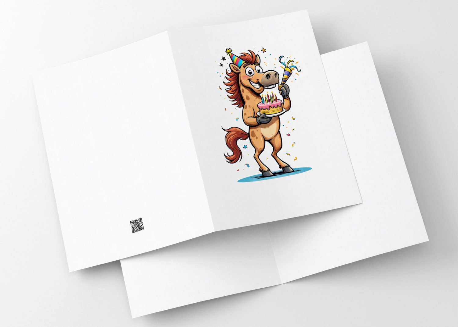 Ten koń robi dokładnie to, co robi każdy porządny koń w chwili absolutnej euforii: jest chodzącą, rżącą imprezą. Konik na kartce z pełnym zaangażowaniem celebruje urodziny: trzyma tort, dmucha w trąbkę, rozsiewa konfetti i wygląda, jakby skradł show na każdej imprezie, na jakiej się pojawi. (no, dobra nie trafia pyskiem w wiadro, ale który koń to robi?)