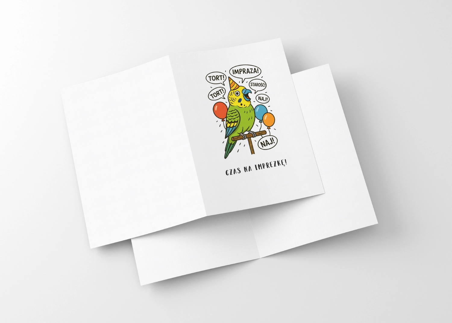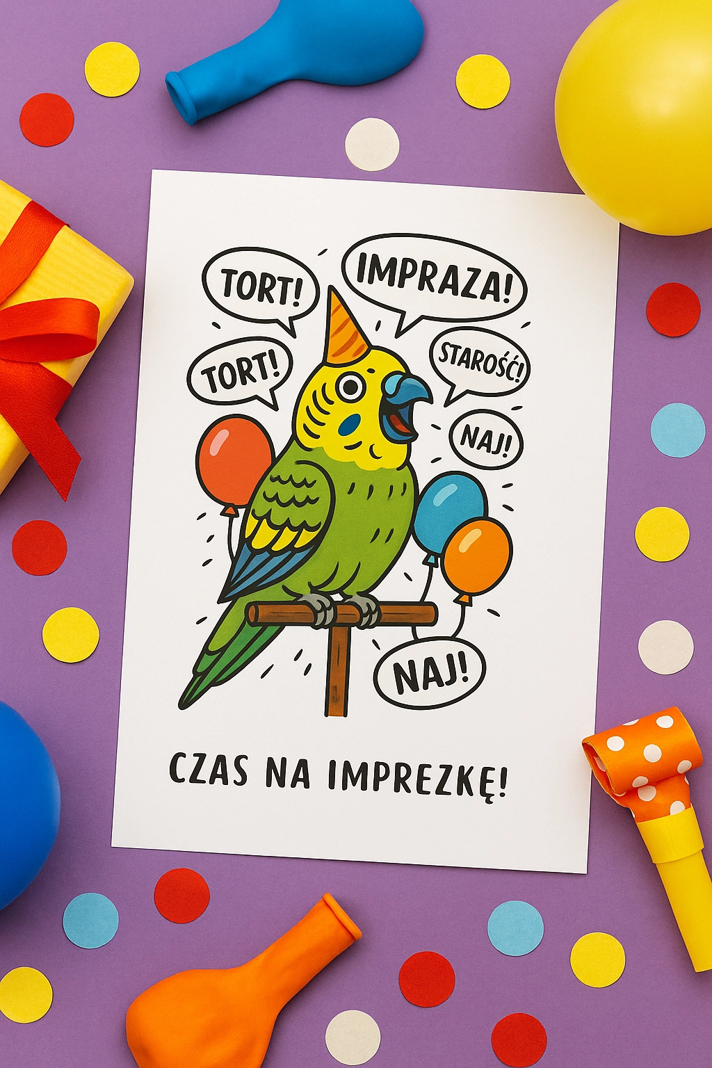 Kartka urodzinowa z papugą, która krzyczy „TORT!”, „IMPREZA!”, „NAJ!” – czyli wszystko to, co powinno wydarzyć się w dzień urodzin. Kolorowa papużka w czapeczce imprezowej to świetny wybór nie tylko dla właścicieli papug, ale też dla wszystkich, którzy lubią poczucie humoru i… nie dopuszczają nikogo do słowa 🙂
