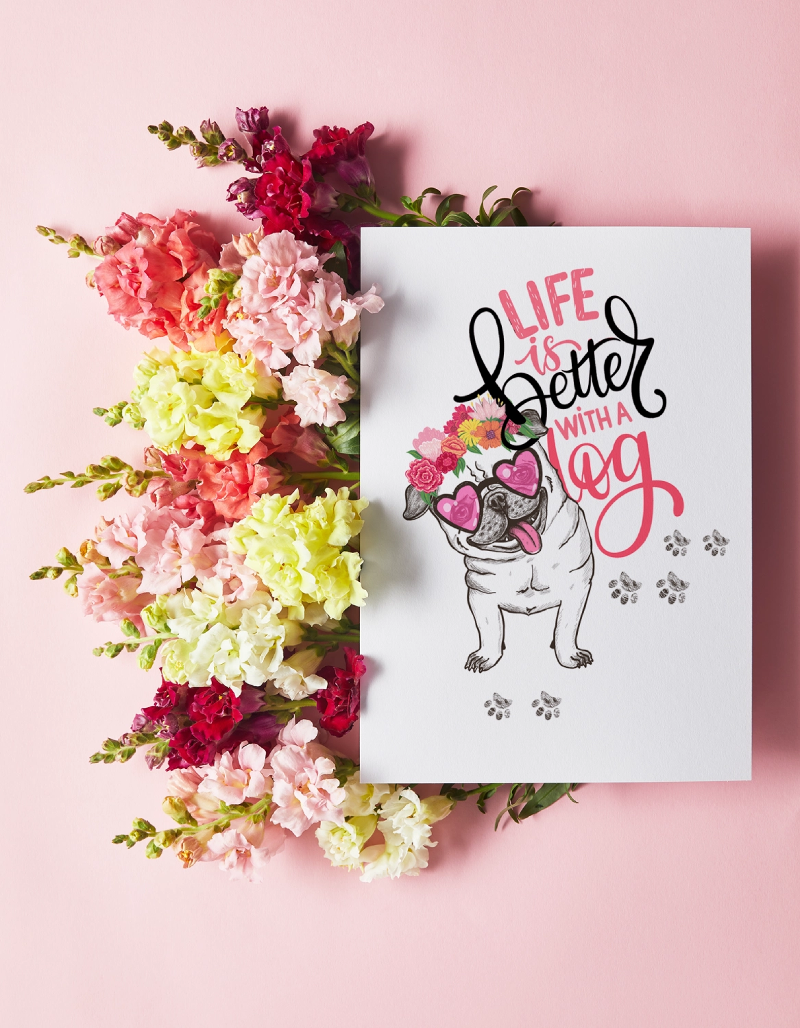 Zaprojektowana z miłością i przymrużeniem oka – ilustrowany mops z serduszkowymi okularami i wiankiem kwiatów mówi wszystko: Life is better with a dog. Nie musisz dopowiadać. Wystarczy, że klikniesz „Pobierz” i podarujesz komuś (albo sobie) tę psią dawkę radości.
