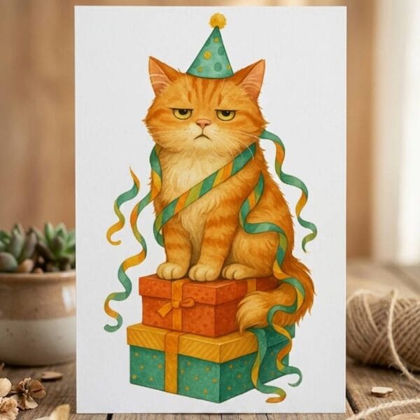 Radosna atmosfera? Jest. Prezenty? Są. Kotek? Siedzi. Entuzjazm? Niekoniecznie. Urodzinowa kartka z wyraźnie zaangażowanym kotem, idealna do wręczenia z pokerową miną.