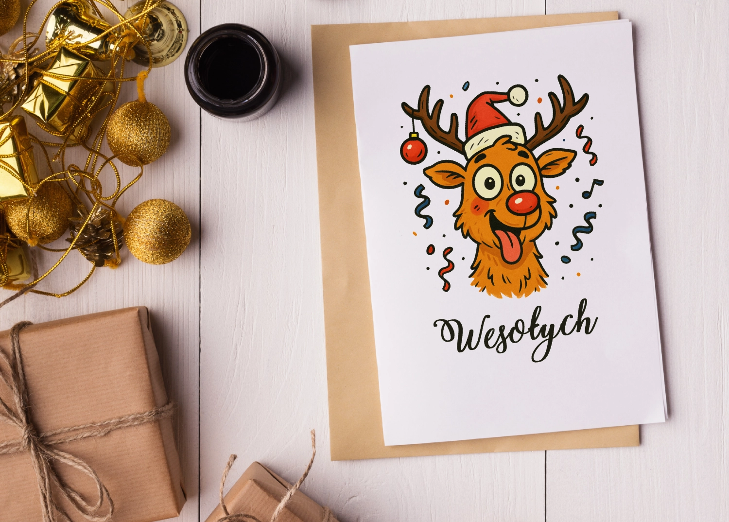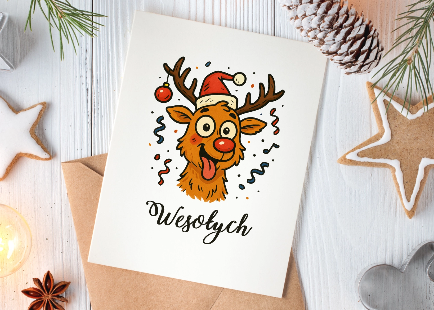 Kartka świąteczna z najbardziej rozbawionym reniferem na półkuli północnej! Z czerwonym nosem, czapką Mikołaja i miną „dopiero co odkryłem pierogi”. Idealna dla znajomego, który co roku mówi, że „nie czuje świąt”… do momentu, aż dostanie właśnie tę kartkę.