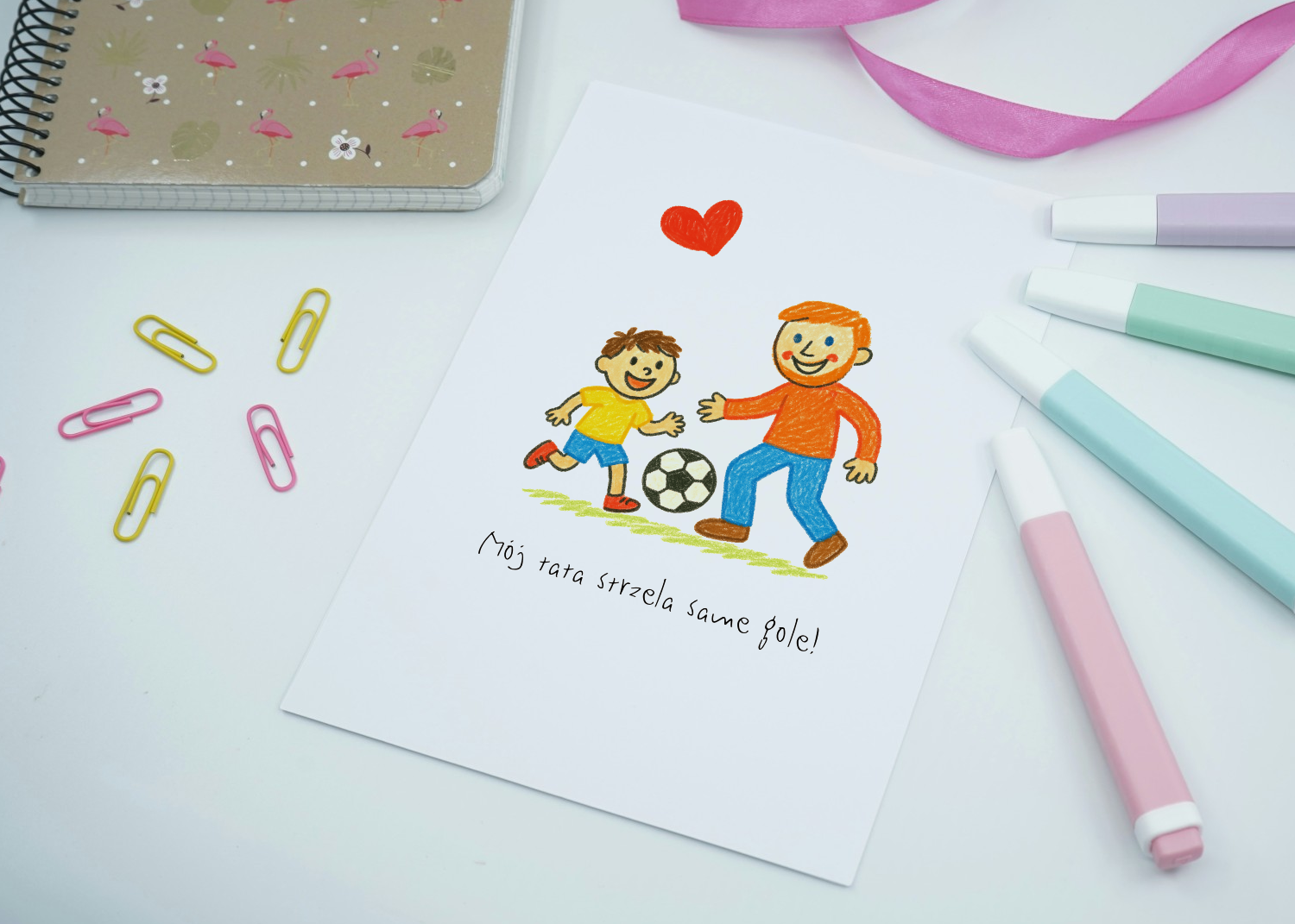Ta laurka to jak mecz życia – prosty rysunek, wielkie emocje i serce na boisku. Na okładce mały piłkarz z tatą i piłką, a nad nimi… wielkie czerwone serce. Czyli dokładnie to, co dziecko widzi, gdy myśli: „Tata to mój mistrz!”. Stworzona z myślą o najmłodszych – do pokolorowania, wręczenia i cichego uśmiechu. Bez kombinowania, bez sklepu, bez „muszę coś kupić”. Wystarczy wydruk, kredki i chwila przed 23 czerwca.