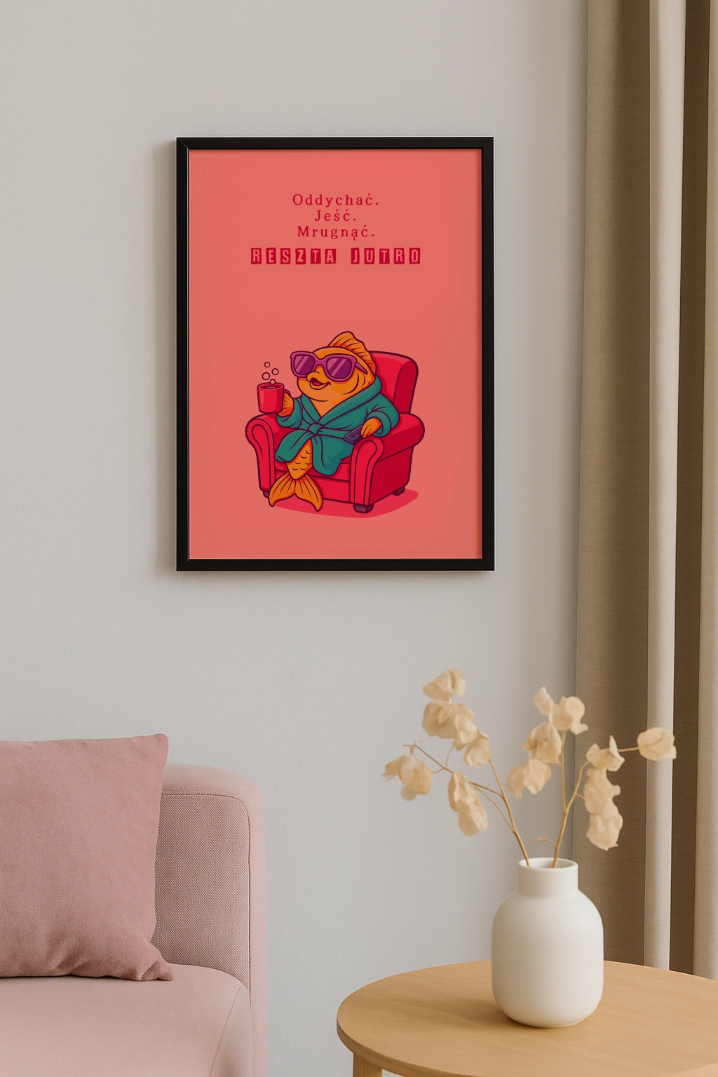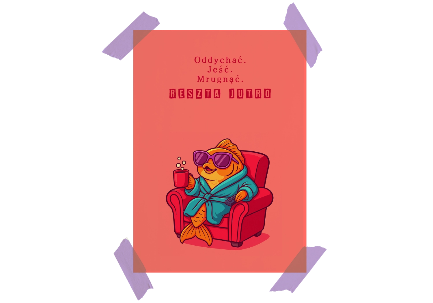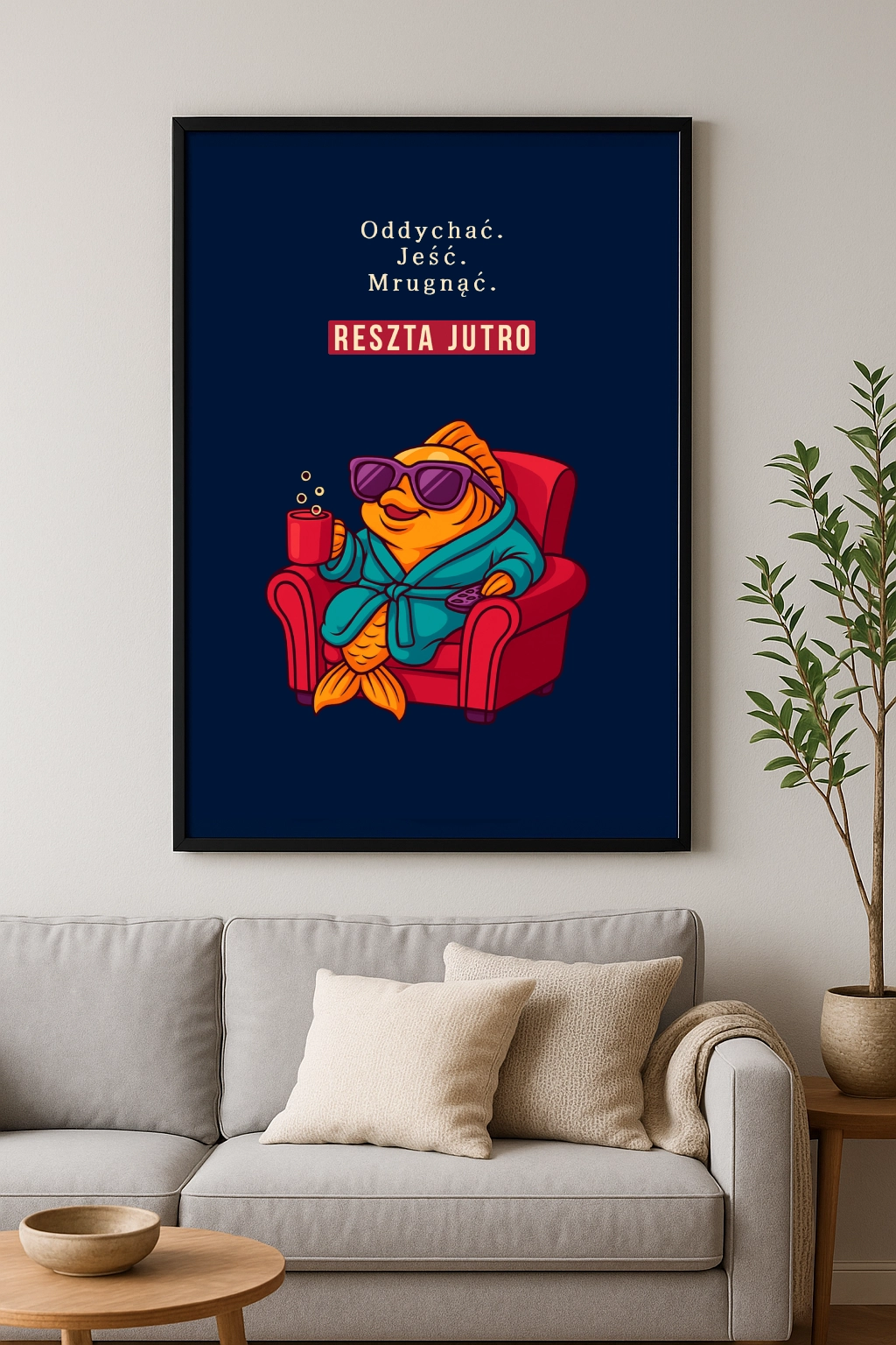 Plakat przypomina, że nie jesteś sam w swoim lenistwie. Wnosi kolor, humor i dystans nawet do najbardziej szarego biura czy salonu. I wreszcie – kiedy spojrzysz na rybkę Vibepic, zrozumiesz, że wszystko, co naprawdę trzeba dziś zrobić, już zostało zrobione. Reszta? Jutro.