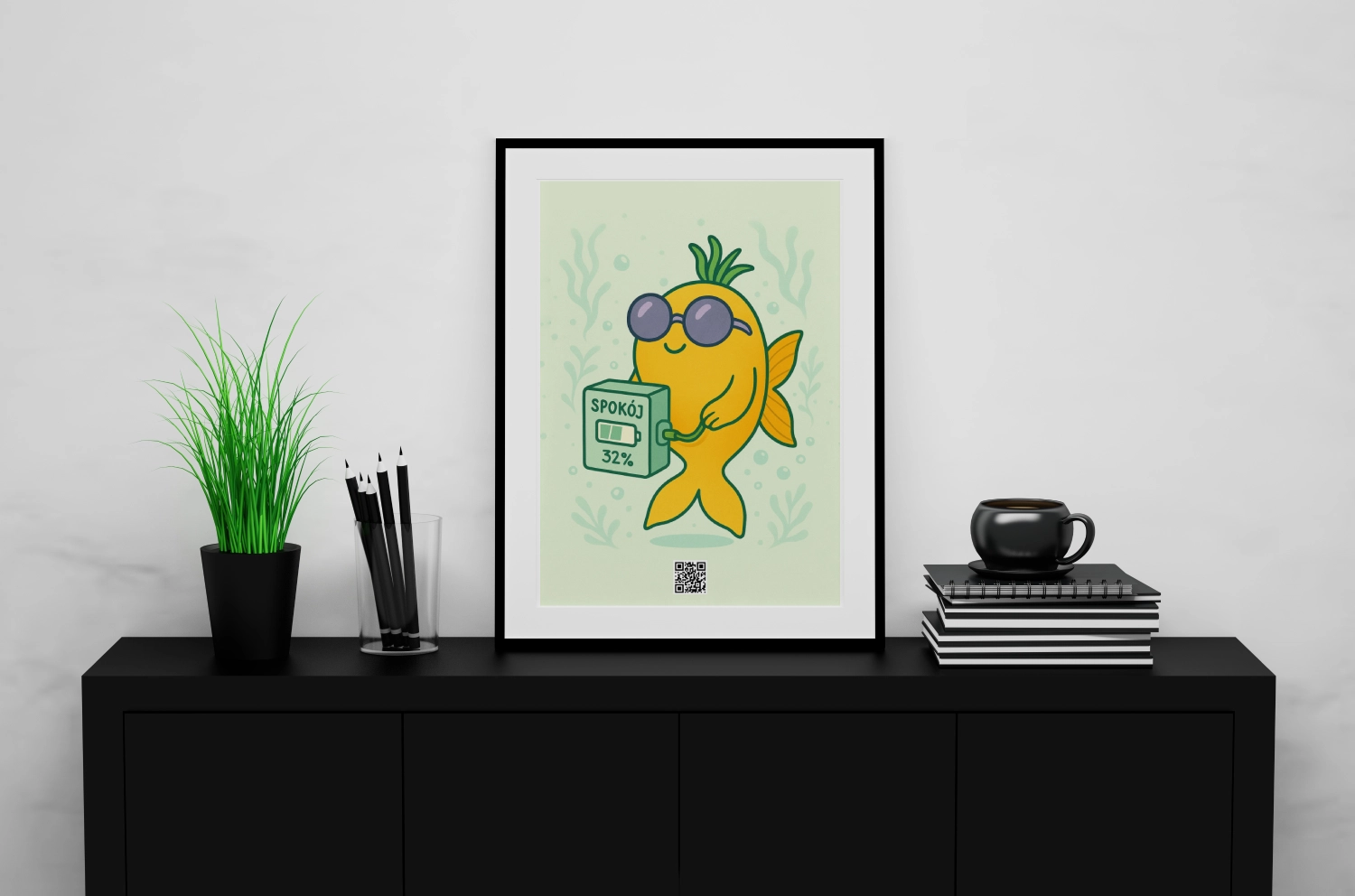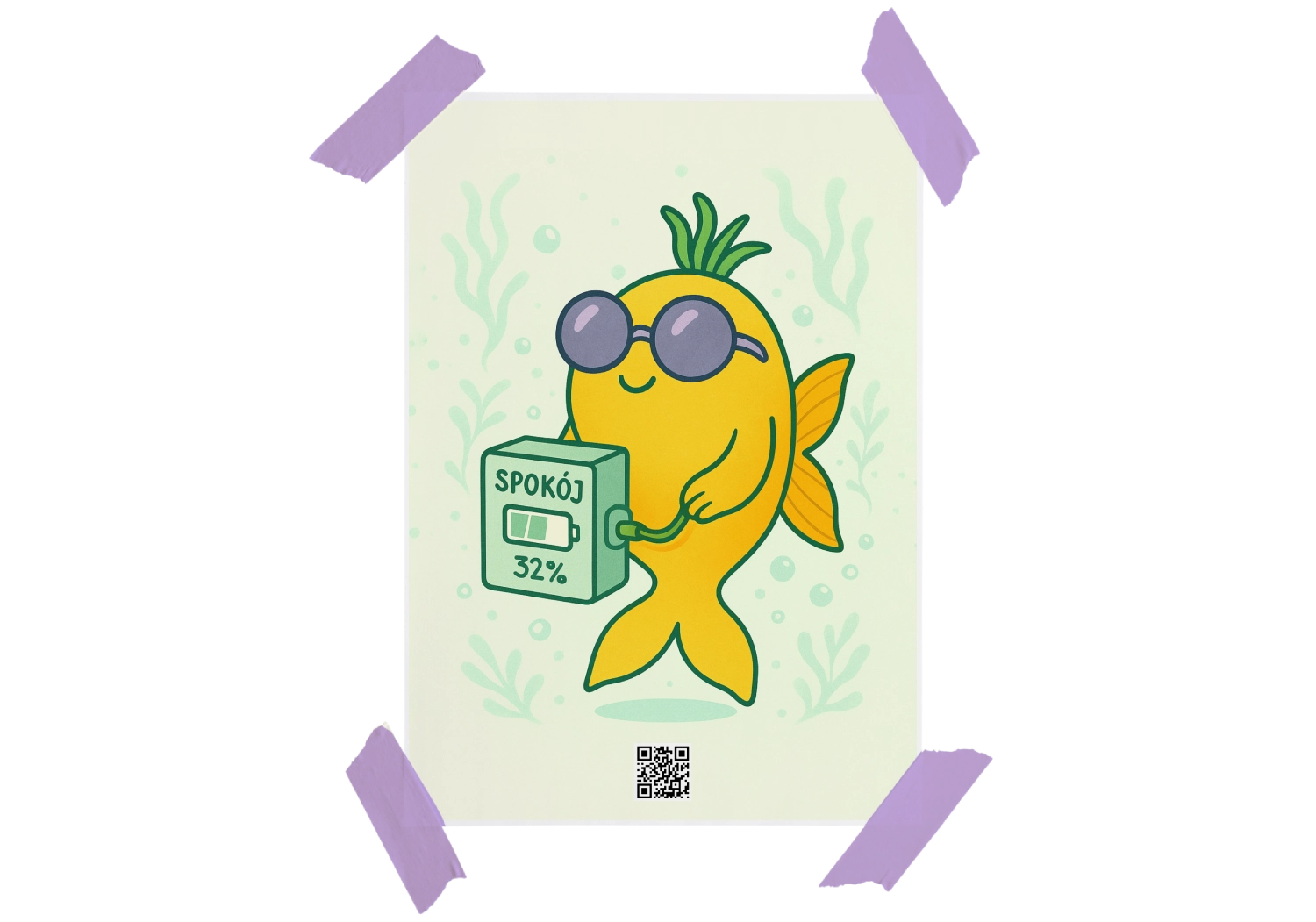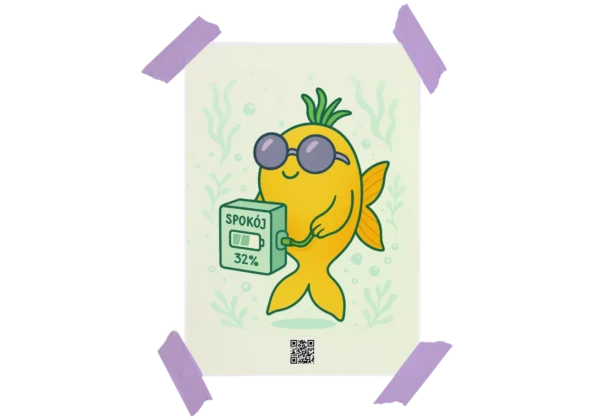 Na szczęście nasza żółta rybka zna się na rzeczy. Ma okulary i niespieszny vibe. I przypomina Ci dyskretnie: spokój to nie stan – to proces. A ładowanie go jest zupełnie okej. Masz więc prawo się ładować. Masz prawo mieć słabszy dzień. I masz pełne prawo powiesić sobie rybkę, która w okularach przeciwsłonecznych trzyma powerbank i niczym się nie przejmuje.