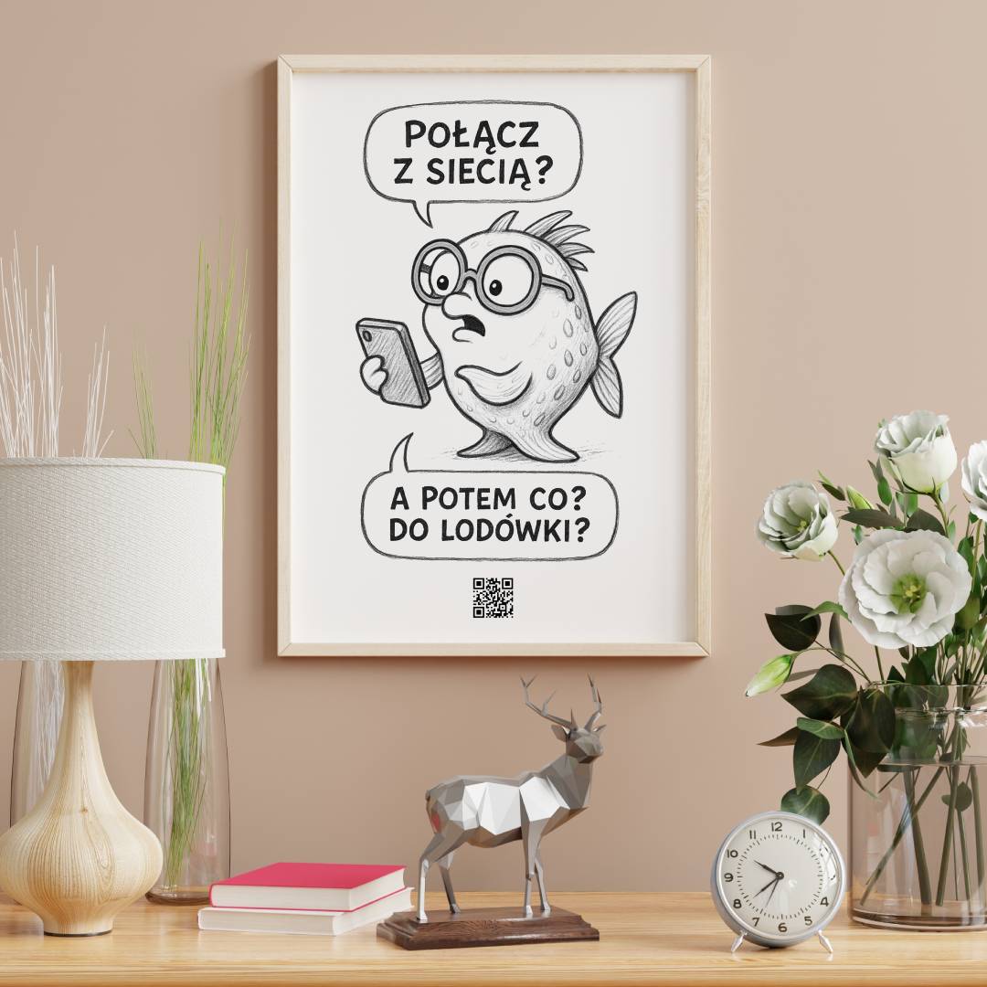 Połącz z siecią? A potem co – do lodówki? Ten plakat to rybia odpowiedź na technostres i nadmiar powiadomień. Drukujesz, przyklejasz, relaksujesz się – i nie musisz nawet znać hasła do WiFi. Idealny plakat na lodówkę, ścianę albo do biura, gdzie nikt nie wyłącza routera.