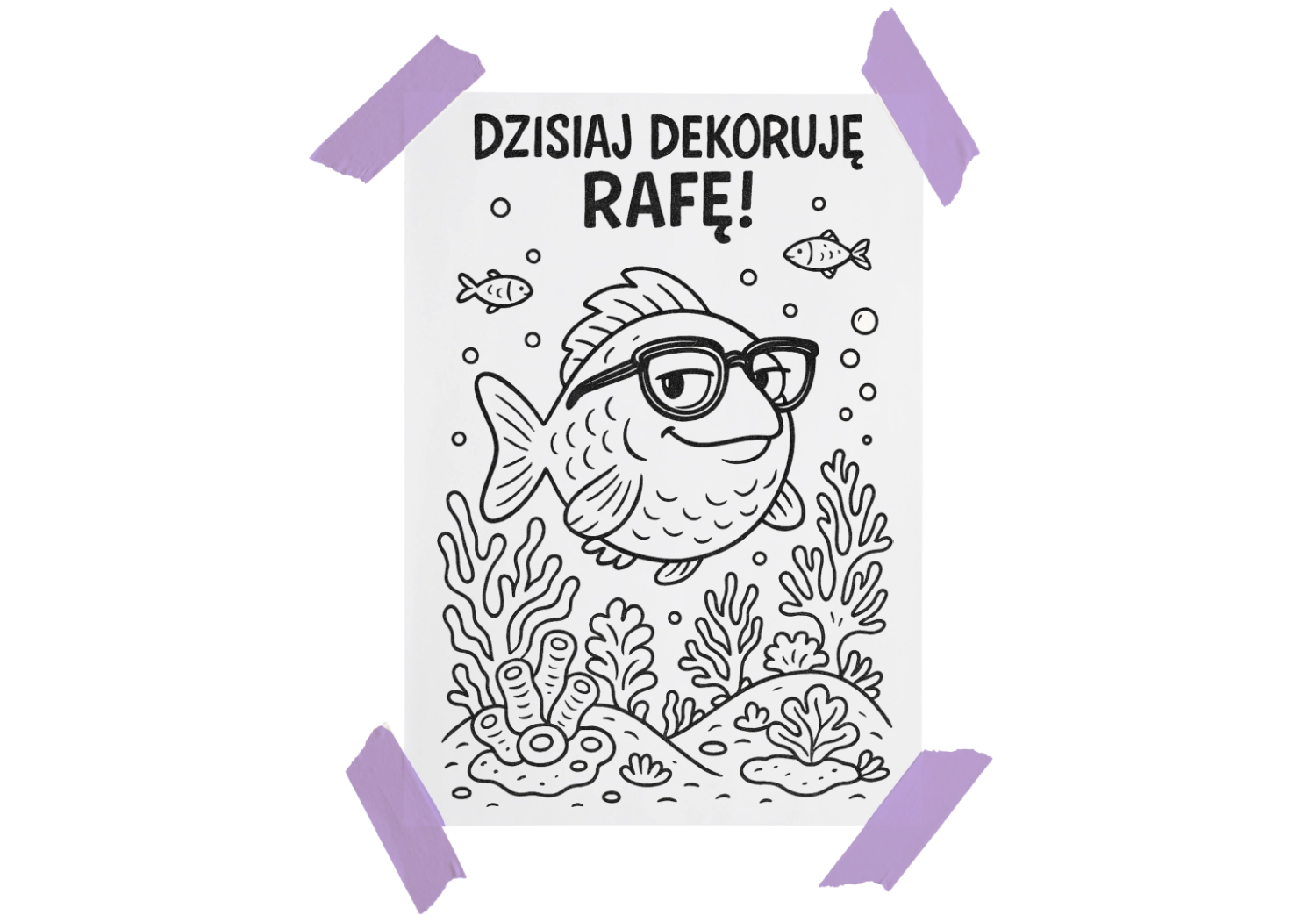 Oto plakat dla wszystkich twórczych dusz, które mają w sobie coś z rybki ozdabiającej swoje podwodne kąty. Czy masz 15 lat, czy 35 – kolorowanka z rafą i rybką w okularach to świetny sposób na chwilę odpoczynku, reset głowy i wyrażenie siebie w najbardziej kolorowy sposób.