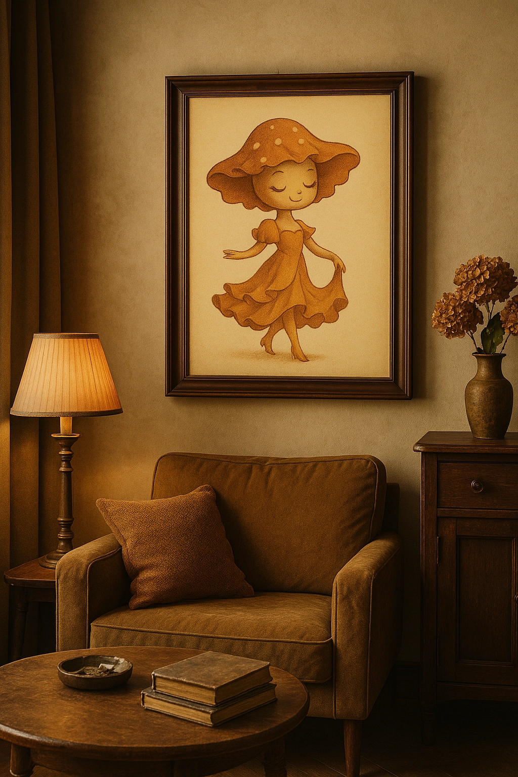 Delikatny plakat w stylu vintage z tańczącą grzybkową dziewczynką. Ciepłe barwy, miękkie linie i retro klimat wprowadzą do wnętrza spokój i odrobinę bajkowej magii. Format A4 do druku (ze spadami 3 mm) do druku w domu lub w punkcie.