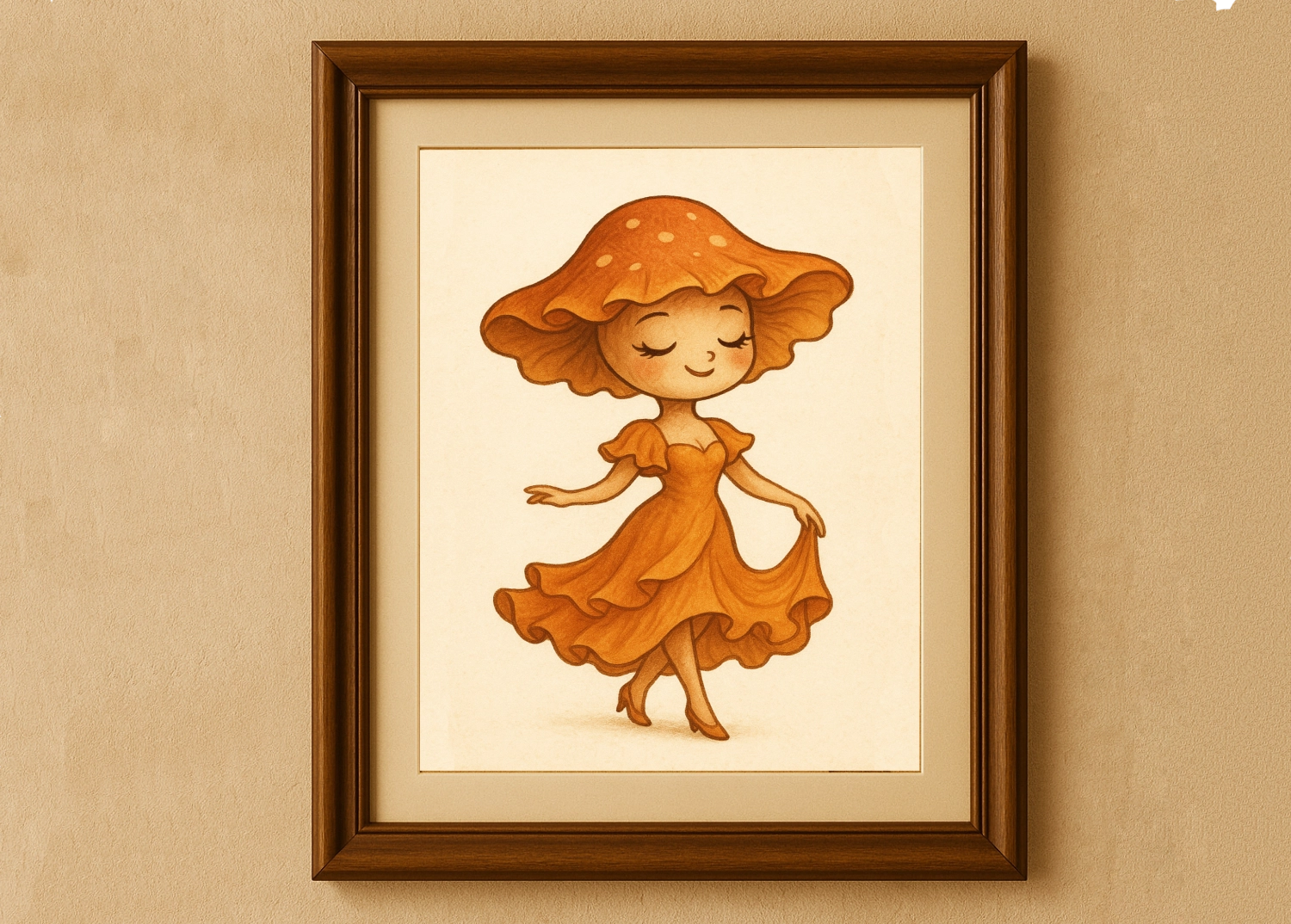 Ten plakat to jak kadr z zaczarowanego snu. Delikatna, uśmiechnięta dziewczynka o kapeluszu jak z muchomora wygląda, jakby właśnie zeszła z polany, na której liście plotkują z wiatrem. Ciepłe odcienie brązu i pomarańczu sprawiają, że od razu robi się przytulnie — jak po kubku herbaty z miodem i cynamonem.