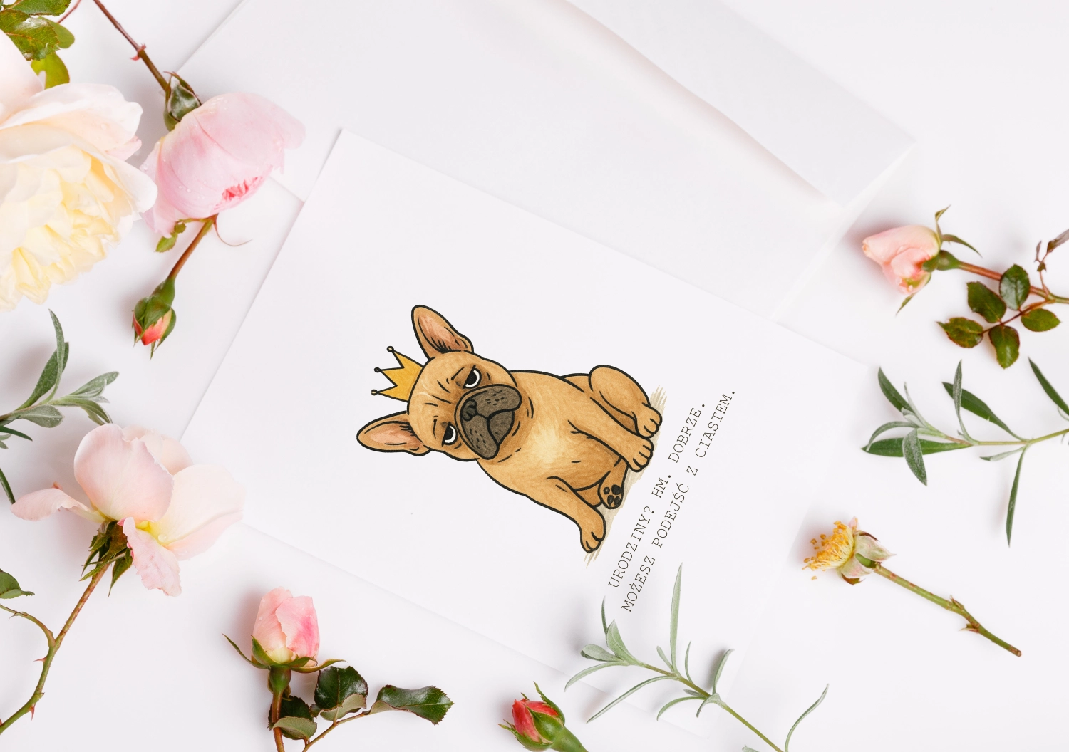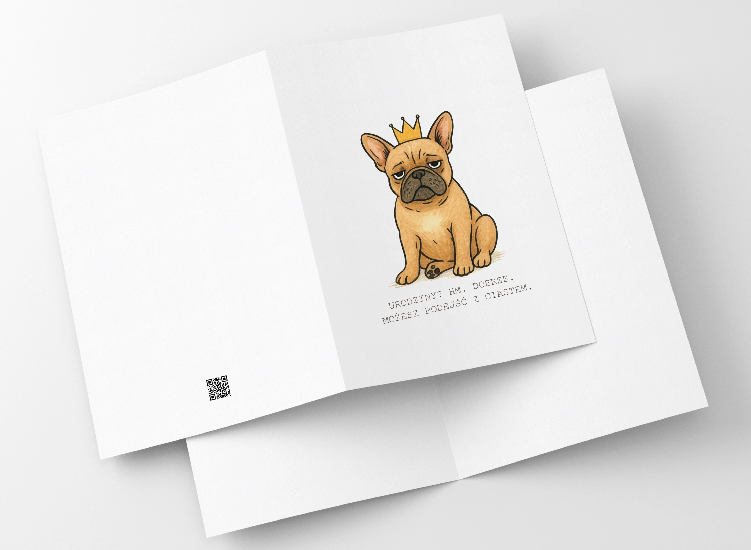 Niektóre psy skaczą z radości. Ten nie. Ten siedzi w koronie i patrzy na Ciebie tak, jakbyś był tylko dostawcą tortu. Kartka z buldogiem to idealny wybór dla tych, którzy lubią urodzinowy vibe w wersji ironiczno-sarkastycznej. Do wydrukowania, wręczenia i czekania na minę obdarowanego. Jeśli się uśmiechnie to znaczy, że był godzien.